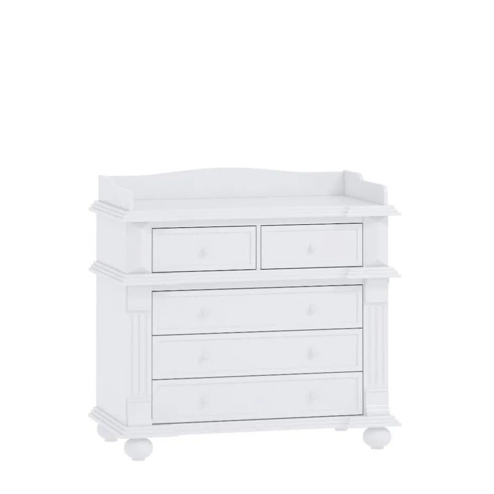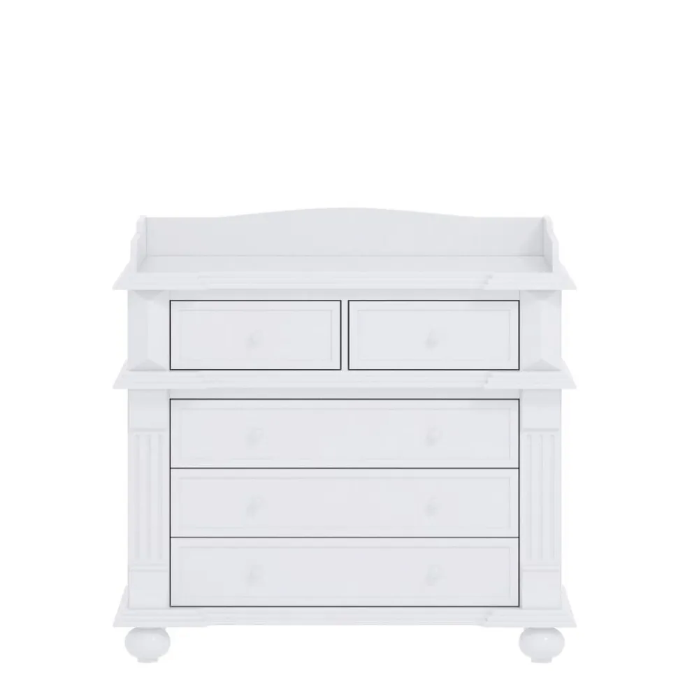 De ruime klassieke commode heeft 5 opberglades. In de 3 brede lades en 2 smalle lades kunnen alle babyspullen overzichtelijk worden opgeborgen. Op het ruime commodeblad heb je voldoende ruimte voor het verschonen, verzorgen en aankleden van je kindje.