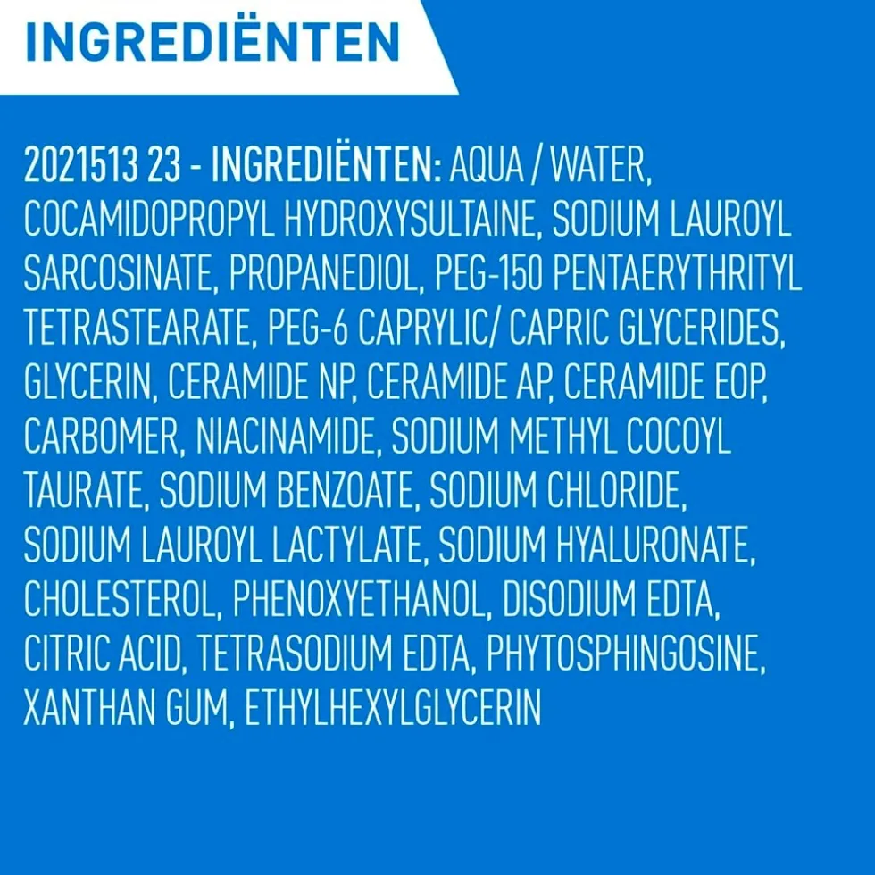 INGREDIENTS: AQUA / WATER, GLYCERIN, COCO-BETAINE, PROPYLENE GLYCOL, SODIUM COCOYL GLYCINATE, PEG-120 METHYL GLUCOSE DIOLEATE, SODIUM CHLORIDE, ACRYLATES COPOLYMER, CITRIC ACID,CAPRYLOYL GLYCINE,CAPRYLYL GLYCOL, SODIUM HYDROXIDE, NIACINAMIDE, DISODIUM EDTA, SODIUM HYALURONATE, SODIUM LAUROYL LACTYLATE, CERAMIDE NP,PHENOXYETHANOL, CERAMIDE AP, PHYTOSPHINGOSINE, CHOLESTEROL, XANTHAN GUM, CARBOMER, ETHYLHEXYLGLYCERIN, CERAMIDE EOP