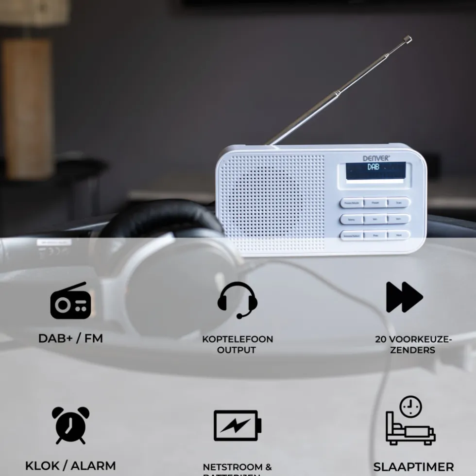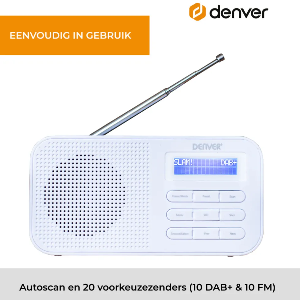 Met de DAB42 van Denver kan jij waar je maar wilt naar je favoriete DAB+ / FM radio zender luisteren! Of je nou in de keuken staat, de badkamer of lekker buiten in het park. Dankzij de DAB radio functie ontvang je signalen met een helder en zuiver geluid. De radio heeft maar liefst 20 voorkeuzezenders over zijn beschikking. Zo is er genoeg keus voor iedereen! De LCD display op de voorkant geeft de naam en soort van het radioprogramma aan! Met de ingebouwde wekkerradio wordt je ’s ochtends wakker zoals jij dat wilt! Kies uit DAB+, FM óf een tradiotonele zoemer! Aan de achterkant vind je een antenne, een batterijenopslag voor batterijen en een kabelingang met AC aansluiting voor netstroom!