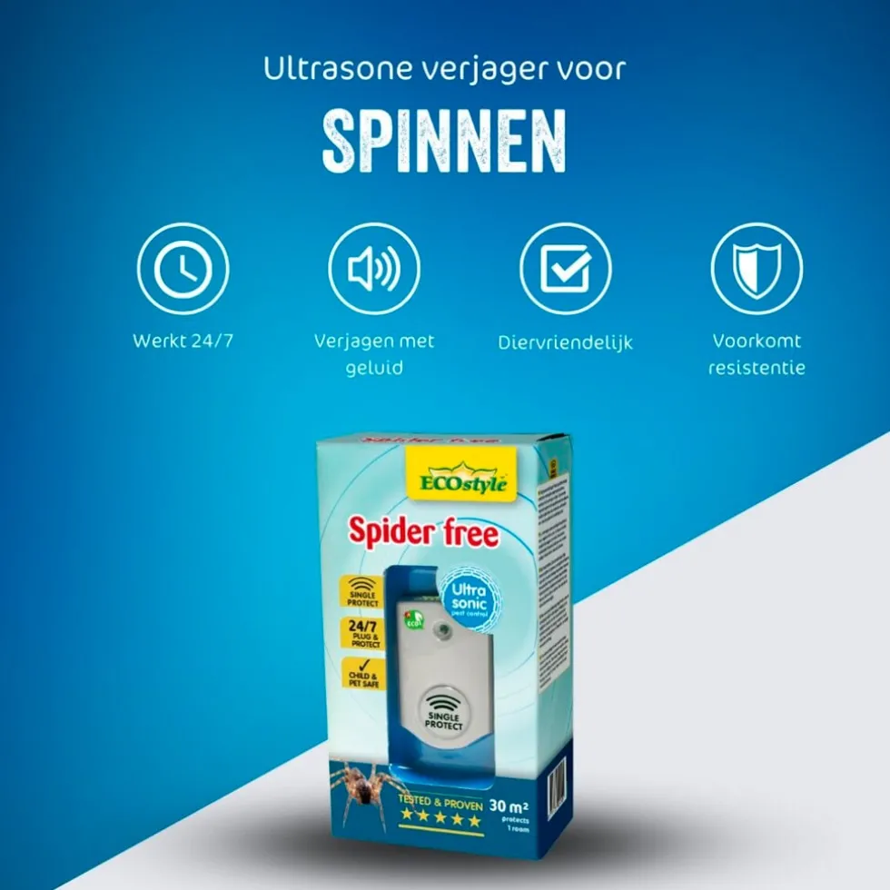 Single Protect verstoort het natuurlijke gedrag van spinnen en creëert een ondraaglijke omgeving voor de dieren, waardoor ze die ruimte vermijden. De variërende frequentie voorkomt dat spinnen resistent worden.