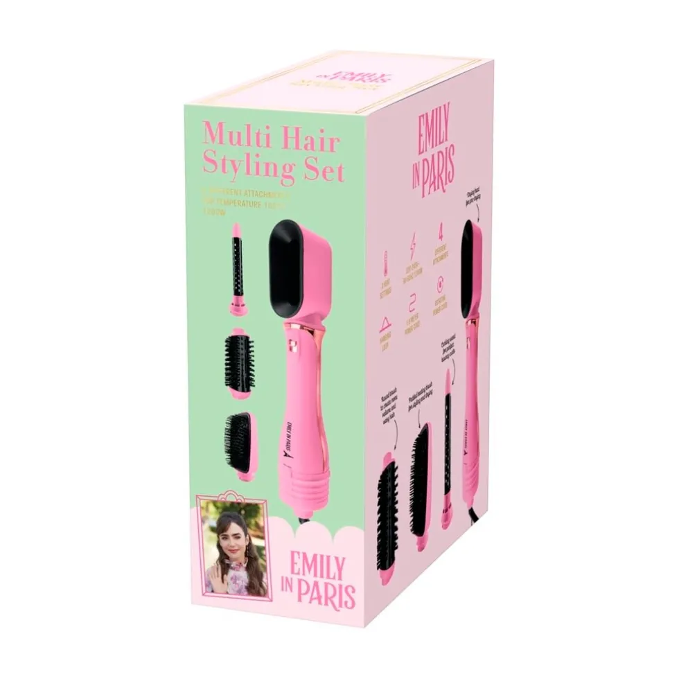 Deze handige Emily in Paris Haarstylingset is je must-have voor een perfecte coupe. De set bevat vier verwisselbare opzetstukken om je haar gemakkelijk te drogen, steil te maken of te stylen.