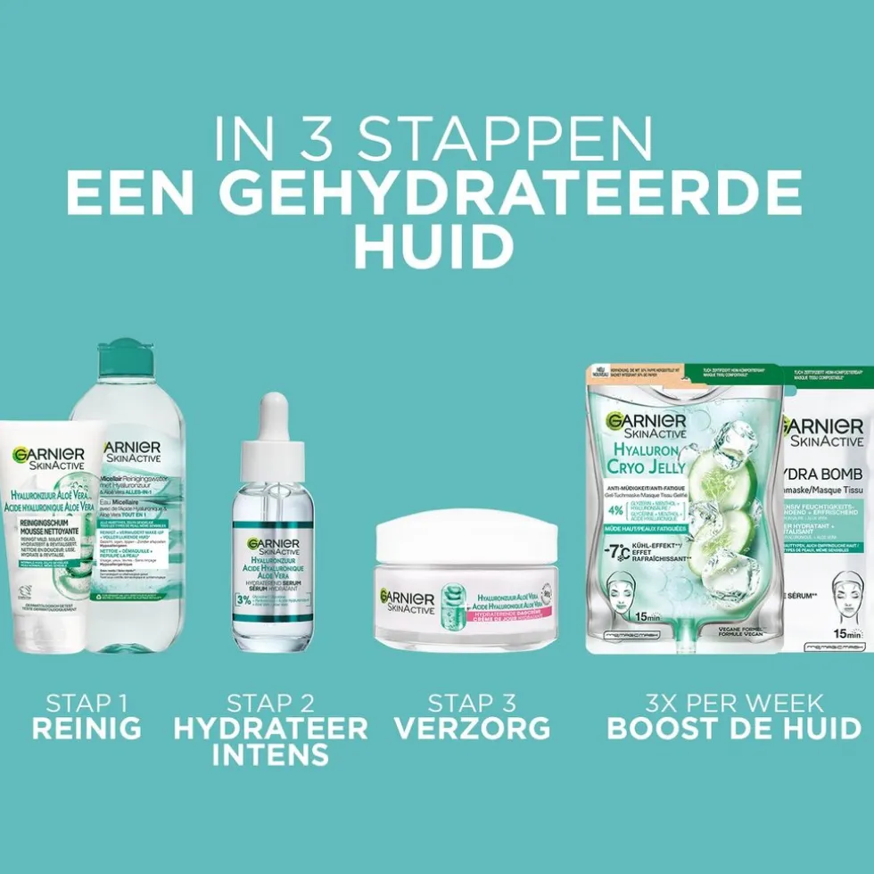 Vermoeide huid? Ontdek het verkoelende Garnier SkinActive Cryo Jelly Anti-Vermoeidheid Gezichtsmasker met Hyaluronzuur dat aanvoelt als een tweede huid met een verkoelend effect.