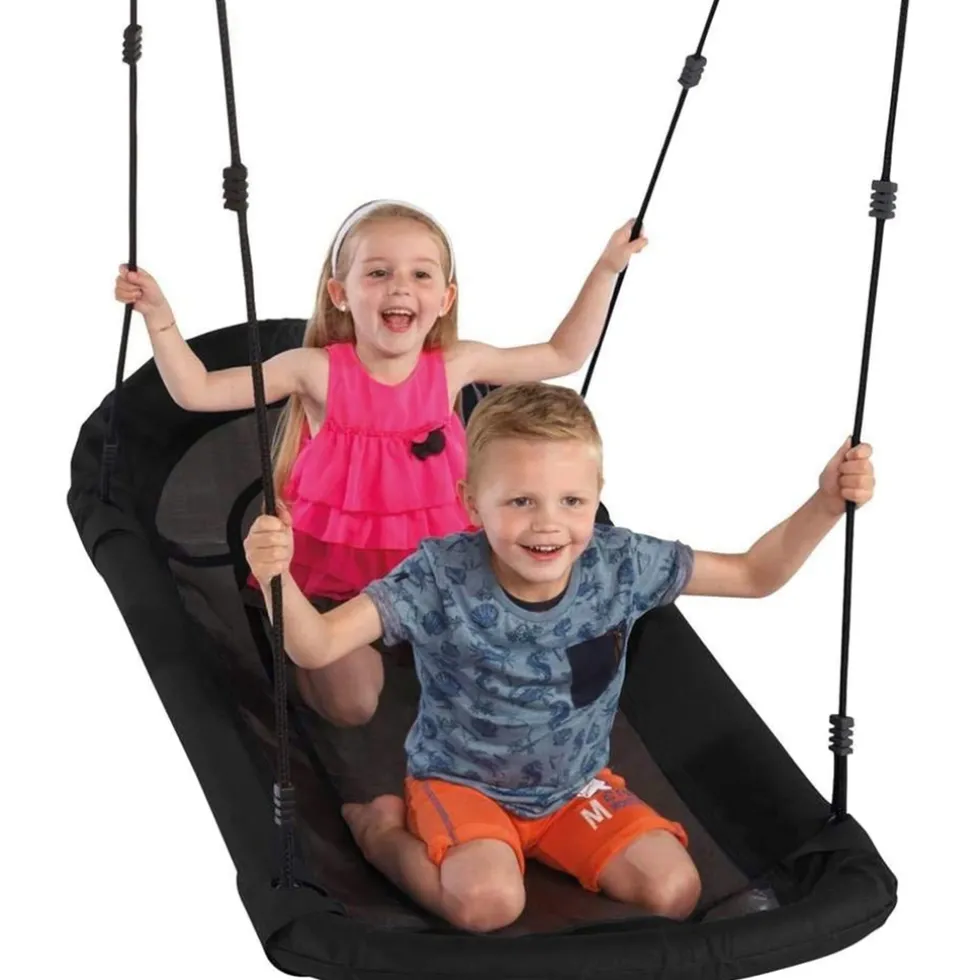 Deze stoere KBT Grandoh nestschommel is geheel uitgevoerd in zwart. Ga jij languit op de Grandoh nestschommel of gaan jullie met zn allen? Met een maximaal belastbaar gewicht van 150 kg kan de KBT Grandoh nestschommel heel wat aan! De KBT nestschommel heeft een rondom gevoerd stalen frame en is gemaakt van waterafstotende stof. Het gevlochten zwarte touw is in hoogte verstelbaar. De Grandoh nestschommel is geschikt voor schommelframes met een hoogte tussen de 200 en 240 cm. De schommel wordt niet gemonteerd geleverd in een compacte doos met een duidelijk montage handleiding. De nestschommel mag enkel gebruikt worden in combinatie met schommelhaken voorzien van een nylon lager. Specificaties: