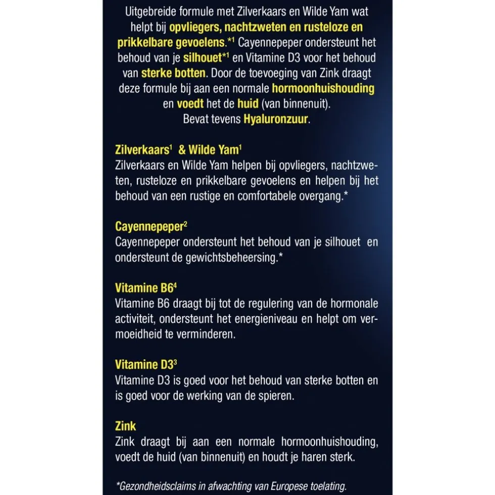 Zilverkaars en Wilde Yam helpen bij opvliegers, nachtzweten, rusteloze en prikkelbare gevoelens en helpen bij het behoud van een rustige en comfortabele overgang.* Cayennepeper ondersteunt het behoud van je silhouet en ondersteunt de gewichtsbeheersing.*= Vitamine B6 draagt bij tot de regulering van de hormonale activiteit, ondersteunt het energieniveau en helpt om vermoeidheid te verminderen. Vitamine D3 is goed voor het behoud van sterke botten en is goed voor de werking van de spieren. Zink draagt bij aan een normale hormoonhuishouding, voedt de huid (van binnenuit) en houdt je haren sterk.*Gezondheidsclaims in afwachting van Europese toelating.;Bevat geen zout. Geen suikers toegevoegd.