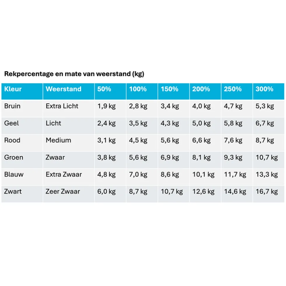 De MoVeS Miniband is verkrijgbaar in zes verschillende weerstanden, zodat je de intensiteit van je training kunt afstemmen op jouw niveau en doelen. De weerstanden variëren van Extra Licht (bruin) tot Zeer Zwaar (zwart). Met een lengte van 30 cm en een breedte van 2,5 cm biedt de band voldoende ruimte en flexibiliteit voor diverse oefeningen, van krachttraining tot revalidatieoefeningen.