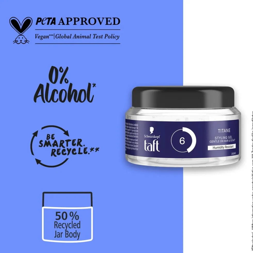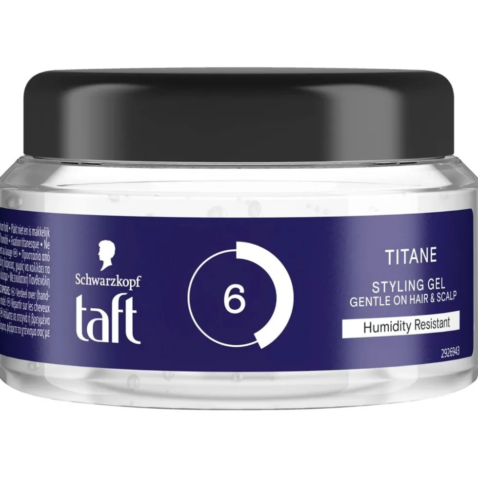 Je bent altijd in controle met de Taft Titane Level 6 Haargel! Deze stylinggel is vochtbestendig, geeft je haar een titaniumsterke hold en plakt niet.