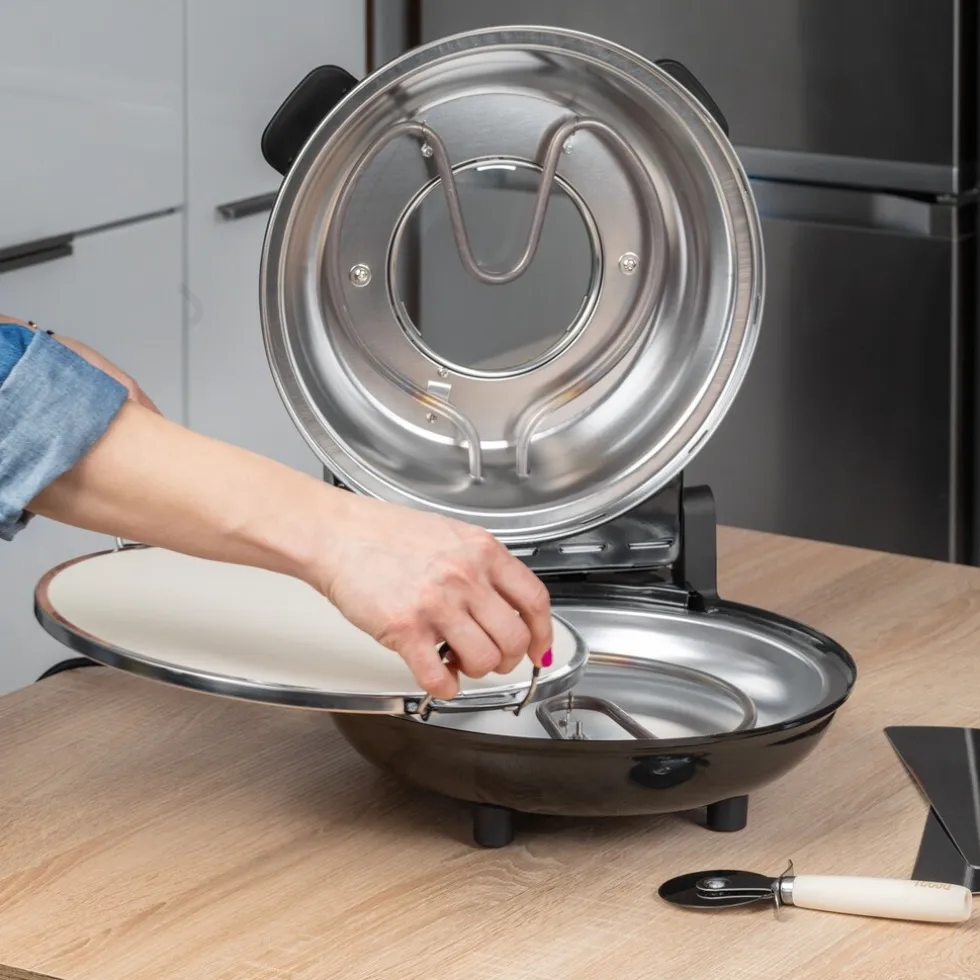 Absoluut! De Teesa pizzaoven geeft je volledige controle. Met de temperatuurregelknop kun je de temperatuur instellen van 80°C tot 400°C, zodat je zowel dikke als dunne korstpizza’s kunt maken. Daarnaast is er ook een bedrijfstijdindicator, zodat je precies weet hoelang je pizza nog moet bakken.