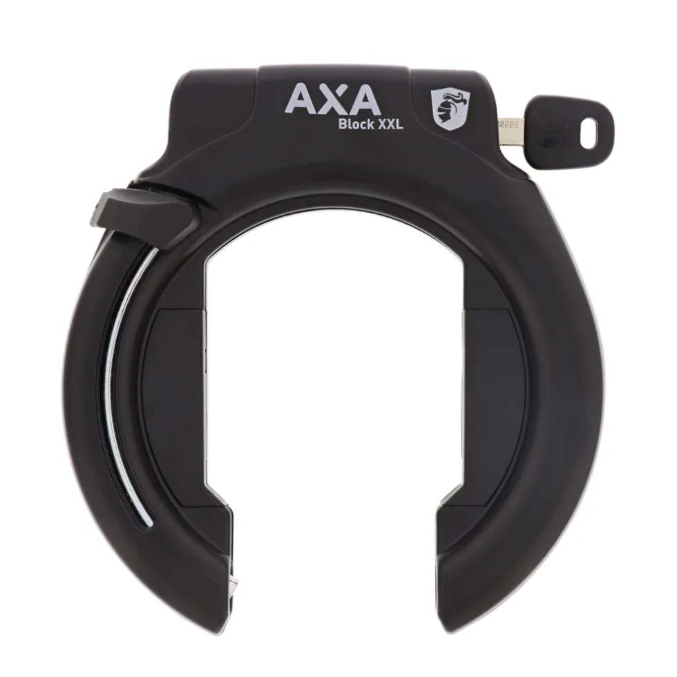 De AXA Block XXL is een hoogwaardig ringslot en heeft de mogelijkheid een ULC plug-in ketting of de UPI plug-in kabel in de zijkant van het slot te steken en zo uw fiets aan een vast object te verbinden. Met ART2** keuring, voldoet hiermee aan de eisen van het Nederlandse ART 2 sterren keurmerk en kan daardoor gebruikt worden om uw voertuig te verzekeren. Het ringslot biedt optimale beveiliging door de anti-boor cilinder en de gehard stalen beugel. De ergonomische bedieningsknop en online sleutelservice bieden u maximaal comfort. De Axa Block XXL heeft een extra brede opening zodat deze ook past bij brede spatborden of ballonbanden.
