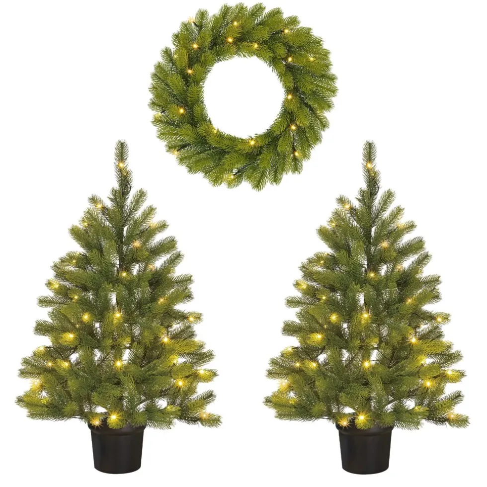 Deze Nagoya set biedt een kant-en-klare, sfeervolle kerstdecoratie voor buiten. Met twee verlichte boompjes en een krans creëer je direct een feestelijke uitstraling bij je huis, zonder gedoe met verlichting of onderhoud. Perfect om je entree of terras sfeervol te versieren tijdens de feestdagen.Product specificaties