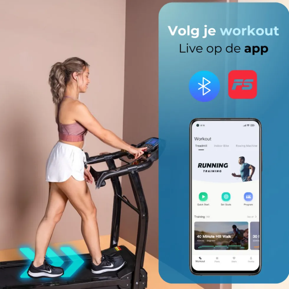Dankzij de geïntegreerde Bluetooth-verbinding koppel je de loopband eenvoudig aan de FitShow app op je smartphone. Via deze app houd je jouw prestaties bij, stel je persoonlijke doelen in en krijg je toegang tot extra trainingsopties. Zo haal je het maximale uit iedere sessie en blijf je gemotiveerd om te blijven bewegen.