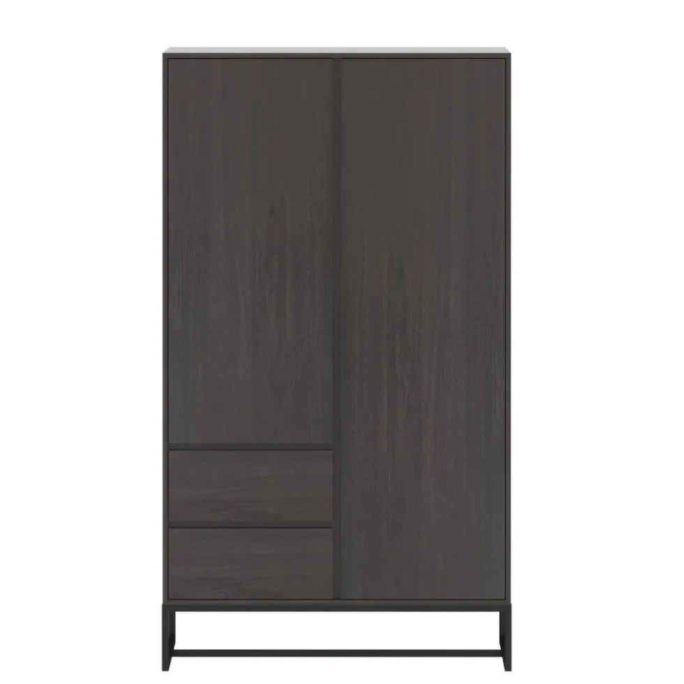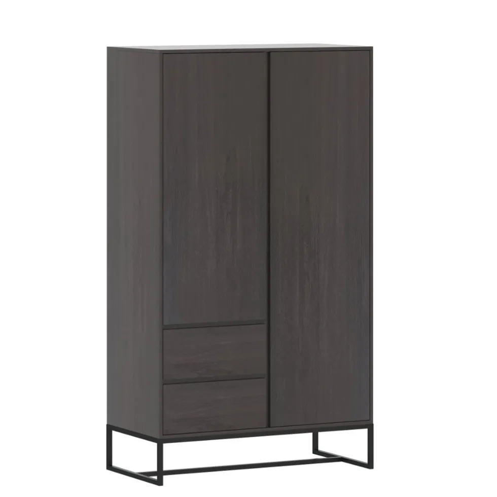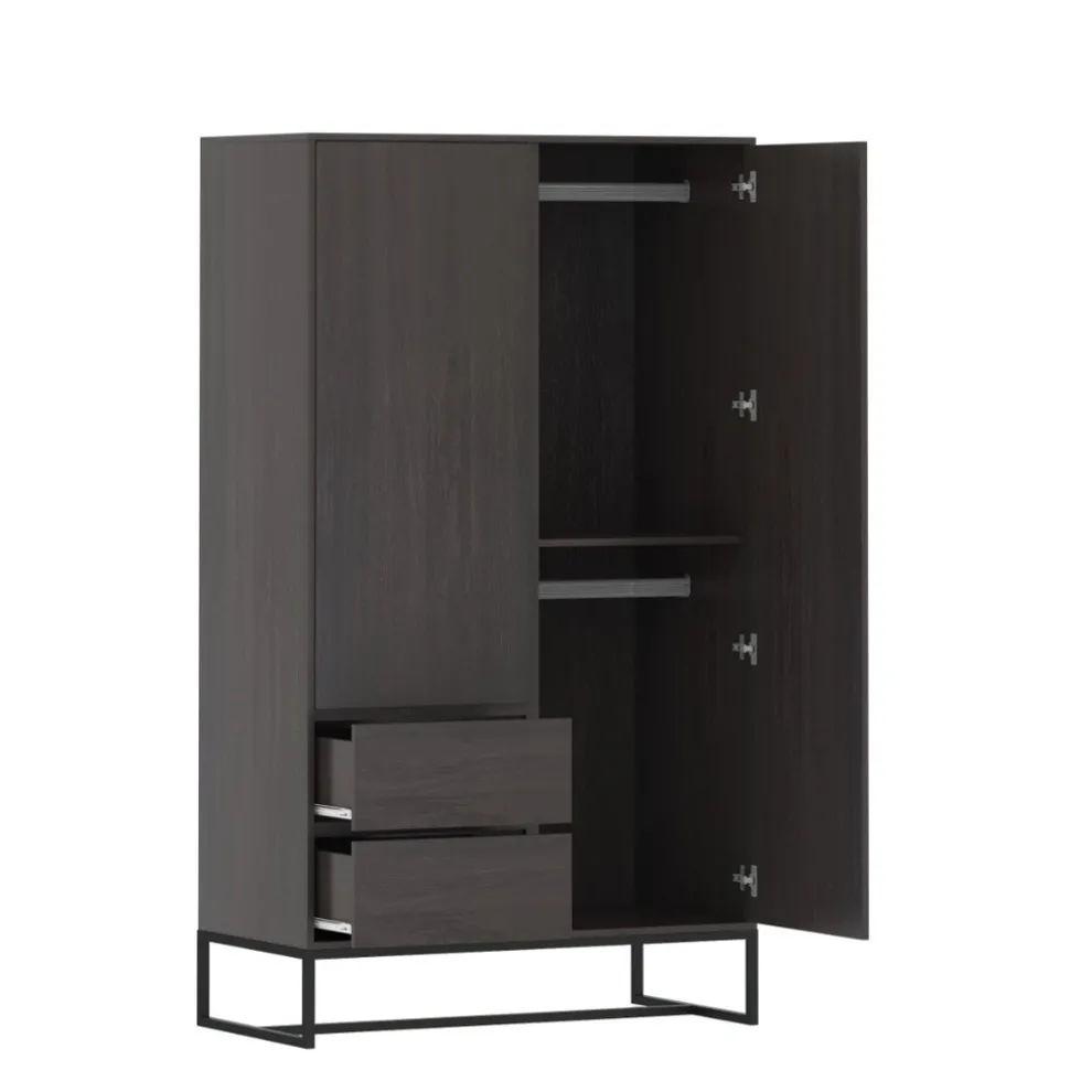 Kledingkast Toscane heeft een donkergrijze kleur met een zichtbare houtnerf. De zwarte metalen pootjes geven de kledingkast een stoere touch en een eigentijds en trendy uiterlijk.