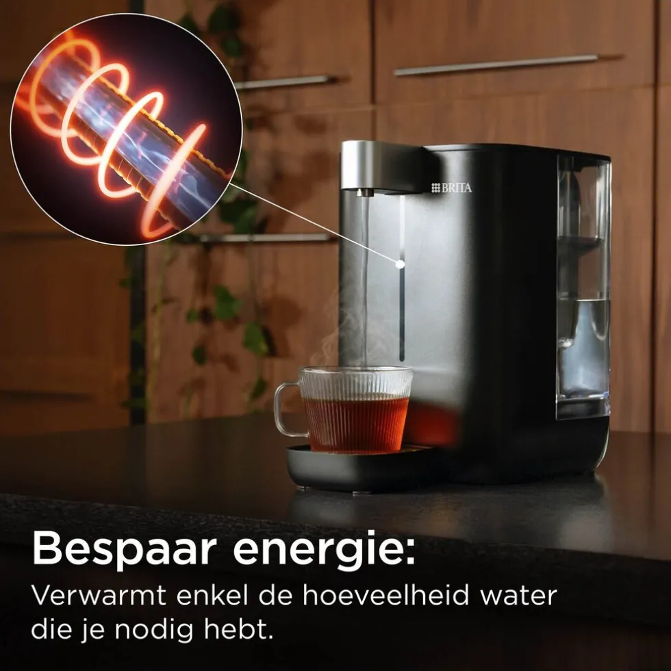 Ben jij een echte theeliefhebber die alleen het beste wil?Met de BRITA Cube heetwaterdispenser zet je jouw favoriete thee in slechts 5 seconden – precies op de juiste temperatuur. Of je nu gaat voor een delicate groene thee of een krachtige zwarte thee: jij bepaalt zelf de perfecte warmte en hoeveelheid. Snel, vers en makkelijk!Altijd de perfecte temperatuur voor jouw favoriete drankGeen gedoe meer met ketels en wachten tot het water eindelijk kookt. De BRITA Cube heeft 5 temperatuurstanden van kamertemperatuur tot 95°C. Zo zet je elk type thee, van matcha tot kruidenthee, op de ideale temperatuur voor maximale smaak.✔ 65°C – voor groene thee✔ 85°C – voor witte thee & lichte infusies✔ 85- 95°C – voor zwarte thee en oolong thee✔ 95°C – voor vruchten- en kruidentheeën✔ 95°C – voor koffie en andere warme drankenSnel, puur smakend en energiezuinigDankzij de krachtige technologie levert de BRITA Cube heetwaterdispenser in slechts 5 seconden heet water – precies de hoeveelheid die je nodig hebt (van 150 tot 450 ml). Geen verspilling van energie of water! Met de geïntegreerde MAXTRA PRO Kalk Expert waterfilter geniet je bovendien van heerlijk zacht water, vrij van kalk en smaakverstorende stoffen.En het mooiste? De innovatieve UV-C technologie verwijdert 99,999% van alle bacteriën, zonder dat jij onderhoud hoeft te doen. Gewoon zuiver, veilig water – elke keer weer.Past perfect in elke keukenDe BRITA Cube heetwaterdispenser is compact van formaat en heeft geen vaste wateraansluiting nodig. De verstelbare lekbak, de duidelijke indicatoren voor lege tank en filtervervanging, én de zelfreinigingsfunctie maken het gebruik extra makkelijk. Gewoon vullen, één druk op de knop, en genieten maar.In de doos:
