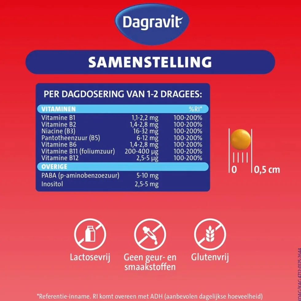 Dagravit Vitamine B-Complex Dragees bevatten vitamine B1, B2, B3, B5, B6 en B12 die een goede energiestofwisseling bevorderen.