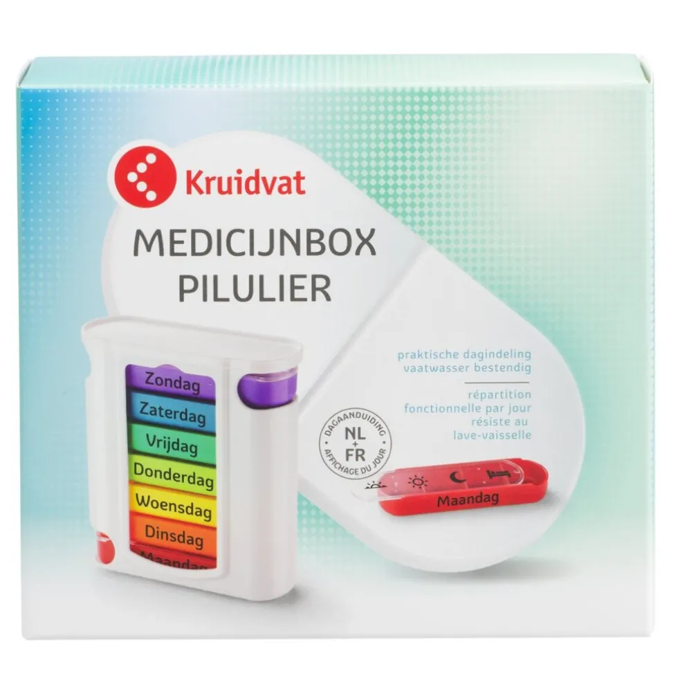 De Kruidvat Medicijnbox heeft zeven losse lades voorzien van een deksel. Deze zeven lades zijn per dag gemerkt.