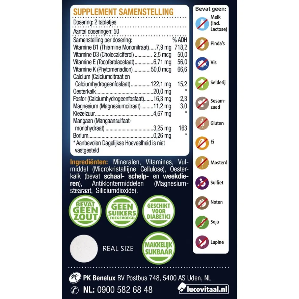 Lucovitaal Oesterkalk Calcium Vitamine D3 & K Tabletten bevatten onder andere oesterkalk, calcium, vitamine D, vitamine K en mangaan. Deze ingrediënten spelen een rol bij het behoud van sterke botten.