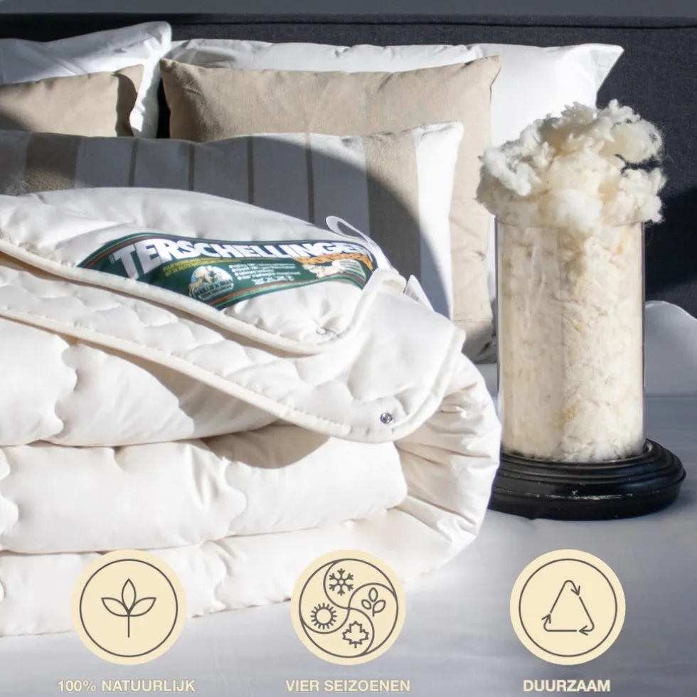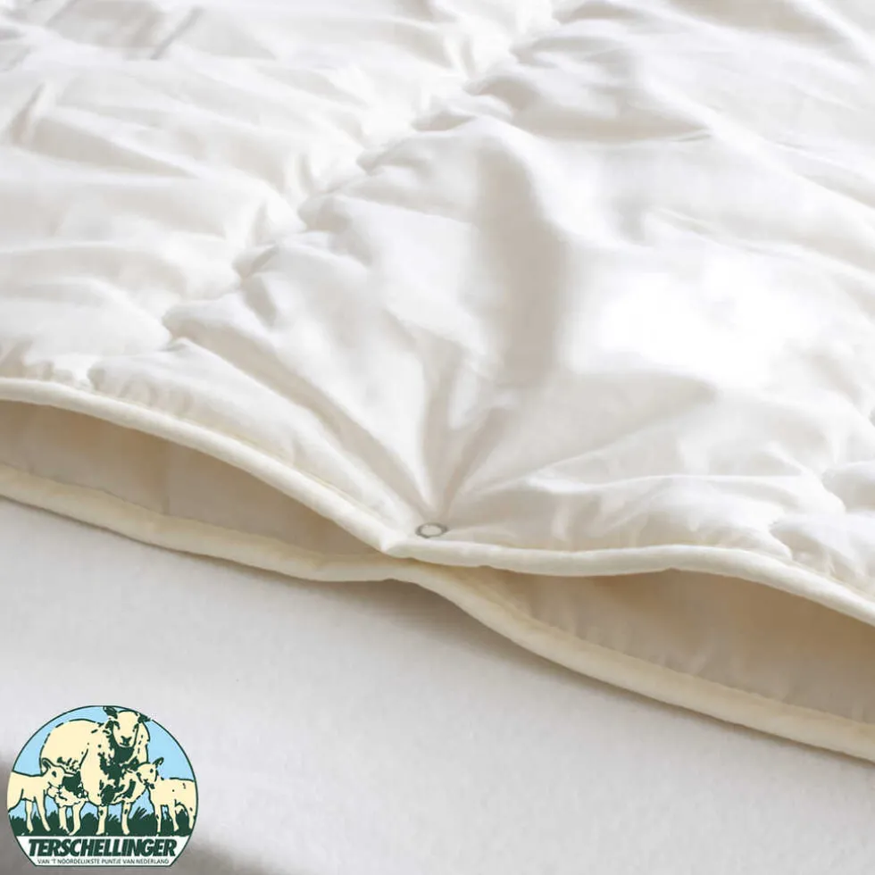 De extreem gekroesde wol-kwaliteit vormt ’n luxe laag van miljoenen luchtkussentjes, die zorg dragen voor optimale ventilatie, onovertroffen vochtregulatie en een unieke warmtespreiding. De gekaarde wol wordt zo behandeld, dat alle natuurlijke ingrediënten (zoals Lanoline) behouden blijven, zodat de unieke werking van wol volledig gehandhaafd blijft. De dekbedden zijn volledig doorgestikt in banen, zodat de edele vulling nooit kan verschuiven en het dekbed soepel om het lichaam voegt. Terschellinger dekbedden zijn brandvertragend, vlamdovend en worden 3 jaar volledig gegarandeerd. Voorzien van sterke metalen drukknopen. Kortom:’n Ideaal dekbed voor zomer én winter van de hoogste kwaliteit. Van top tot teen natuurlijk comfort…