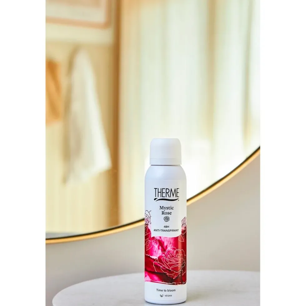 Therme Mystic Rose Antitranspirant Spray biedt 48 uur lang effectieve bescherming tegen transpiratiegeur en vochtvorming. Geniet van de bloemengeur van roos gecombineerd met zoete lychee en verleidelijke cacao.
