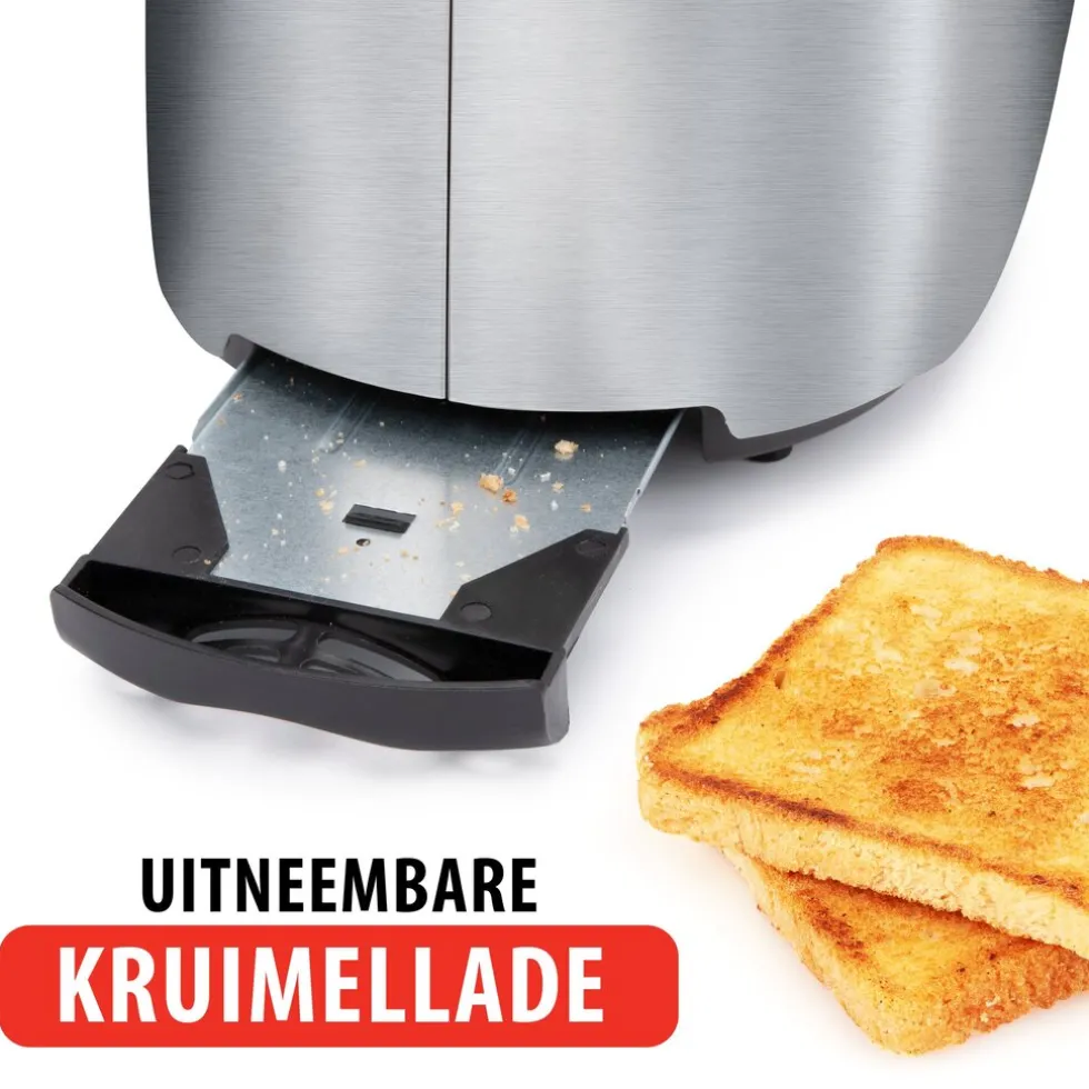 Per keer rooster jij twee sneetjes brood in de gleuven van de toaster en op het toastrek kun jij rond brood plaatsen ter verwarming. Het broodrooster is voorzien van een indicatielichtje om aan te geven wanneer het apparaat klaar is voor gebruik. Wanneer het brood klaar is met het door jou ingestelde bruiningsniveau, springt de sneetjes automatisch omhoog, zoals je dit gewend bent van een broodrooster. De onderkant van de toaster is voorzien van een lade om kruimels in op te vangen en gemakkelijk is te legen. De voetjes zijn voorzien van anti-slip, jouw broodrooster blijft staan waar die staat!