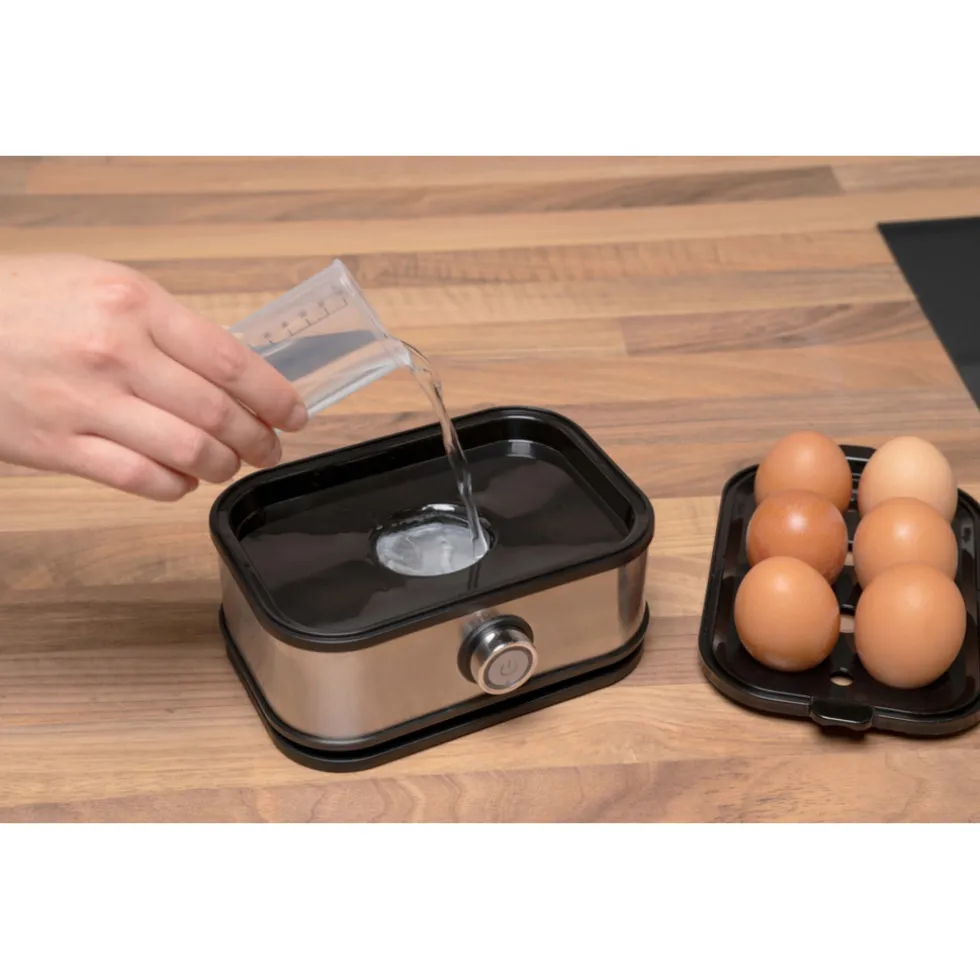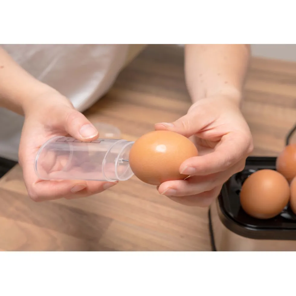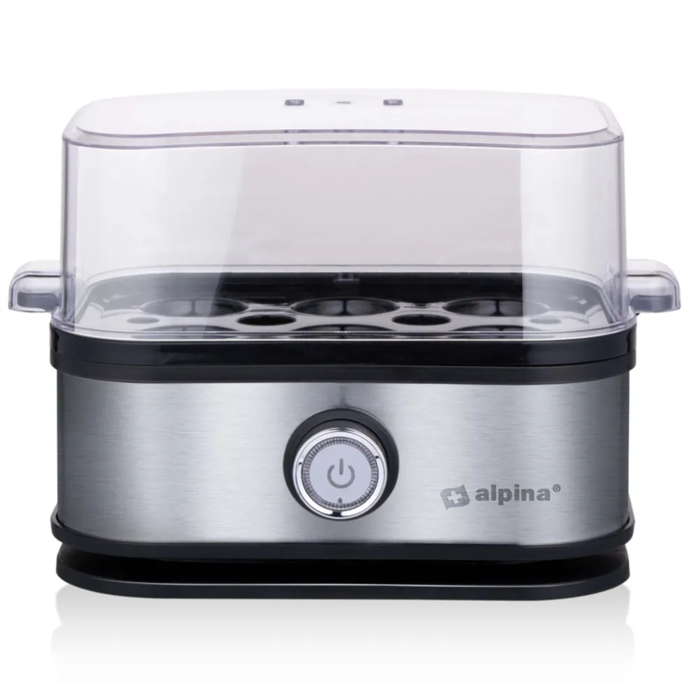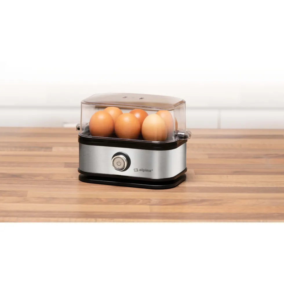 Met de elektrische eierkoker van alpina kook jij tot 6 eitjes tegelijk precies zoals je ze lekker vindt. In de handleiding kun je terugvinden hoe lang je nodig hebt om het aantal eieren dat er tegelijk in de elektrische eikoker zit te koken tot het niveau dat je graag wilt. Steek een gaatje in de eieren met de bijgeleverde maatbeker met eierpen om het barsten tijdens het koken te voorkomen. Het product heeft een indicatielampje om aan te geven wanneer het klaar is voor gebruik. Nadat de eitjes klaar zijn haal je ze gemakkelijk uit de eierkoker met de verwijderbare eierschaal.