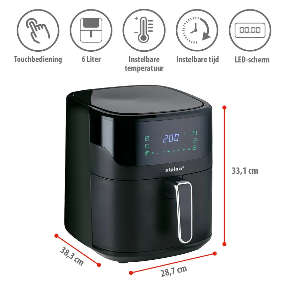 Bereid op een gezondere manier, zonder olie, je favoriete soort friet en snacks met deze airfryer XL van alpina. Met een inhoud van maar liefst 6 liter is deze heteluchtfriteuse perfect voor gezelschappen tot wel 6 personen.Voordelen alpina airfryer 6L