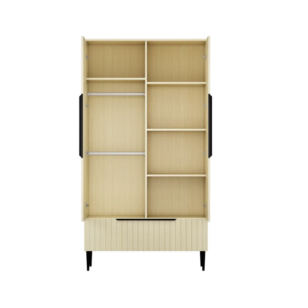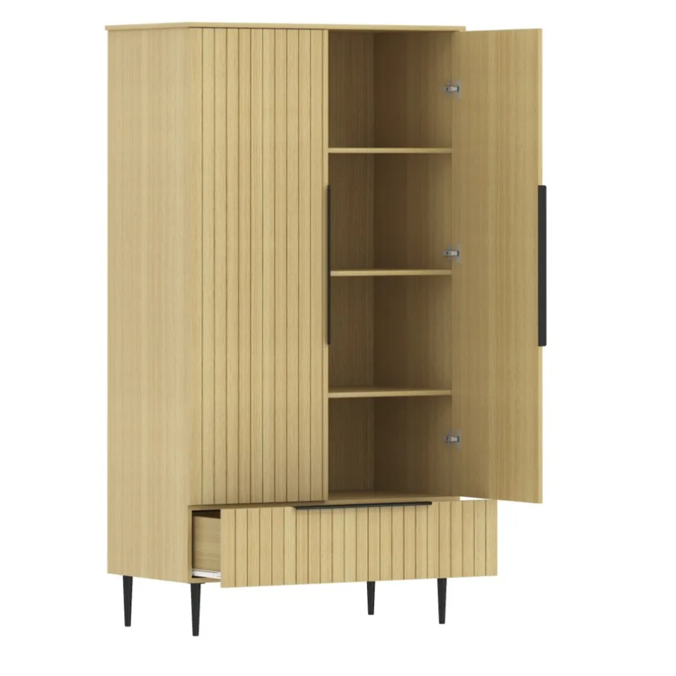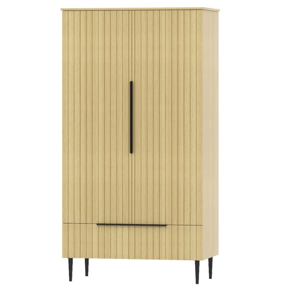 De kledingkast heeft een natuurlijke uitstraling. De fronten van de kast hebben een stijlvol reliëf patroon. De kledingkast is afgewerkt met stoere details, zoals de zwarte handgrepen en de zwarte pootjes. Met de kledingkast in de babykamer heb je altijd voldoende opbergruimte!