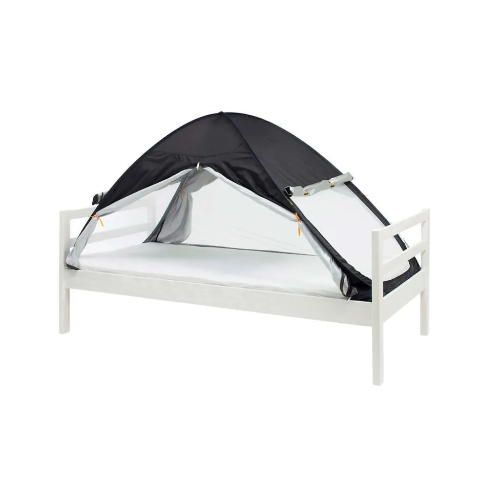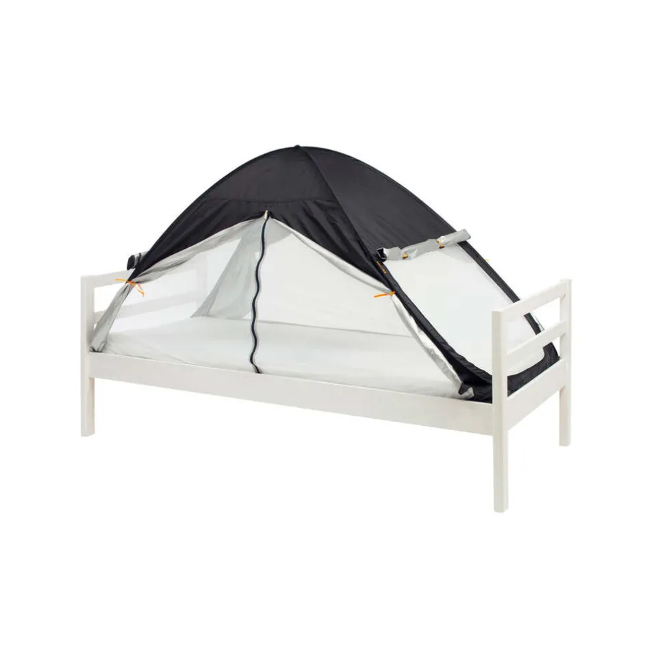 Het matras plaats je eenvoudig via de zijkant in de tent zonder gedoe of verschuivingen. Door zijn compacte formaat neem je de bedtent moeiteloos mee op vakantie, logeerpartijen of in de auto. Naast functionaliteit biedt de tent ook een speelse ruimte voor kinderen.
