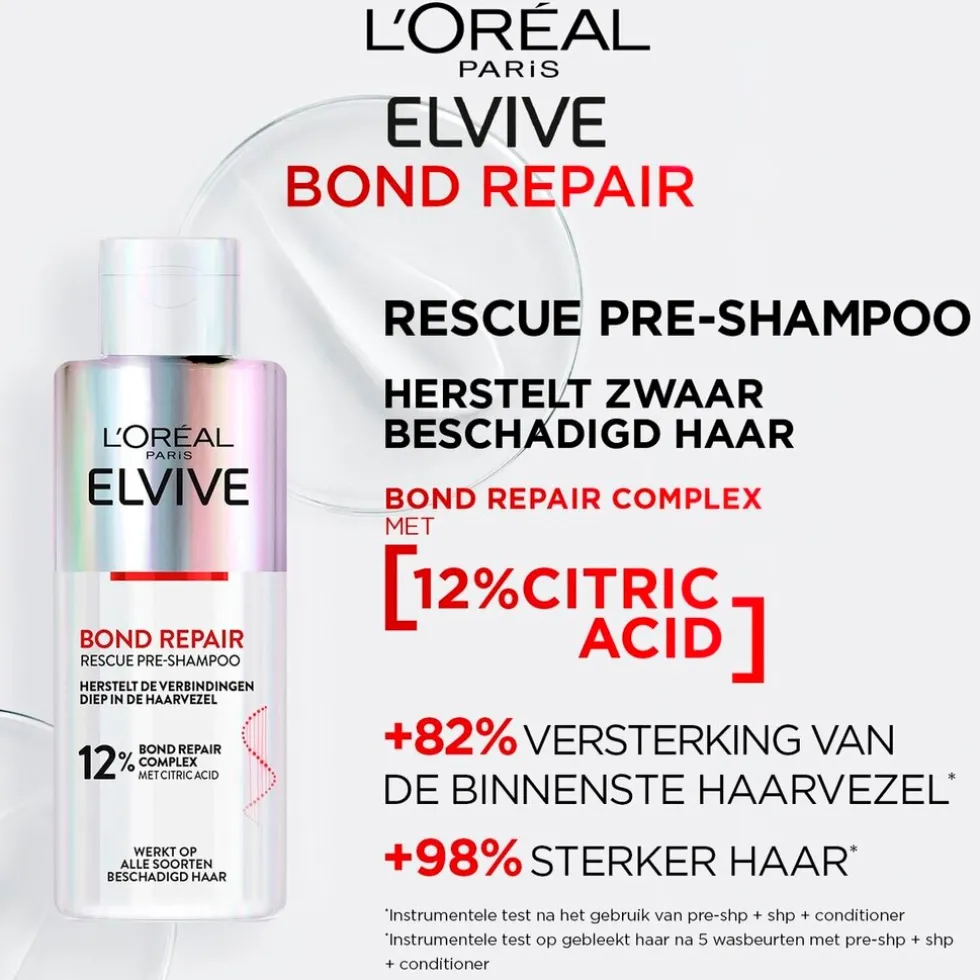 L’Oréal Paris Elvive Bond Repair Rescue Pre-Shampoo herstelt je haar intensief. Met de hoogste concentratie Bond Repair complex (12%) geeft de pre-shampoo je haar een citroenzuurboost.