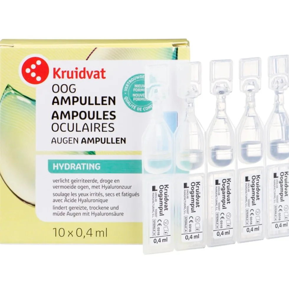 De Kruidvat Oogampullen bevatten hyaluronzuur en verlichten geïrriteerde, droge en vermoeide ogen. In de verpakking zitten tien stuks van 0,4 ml.