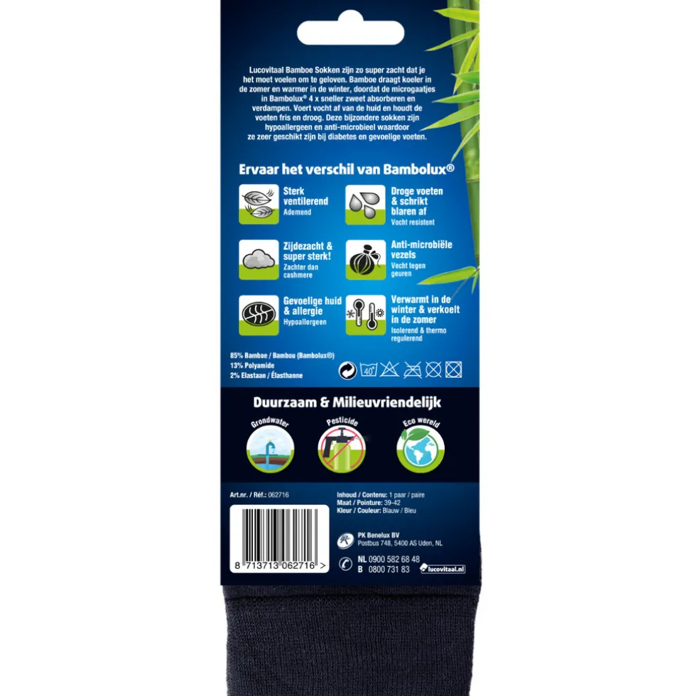 Lucovitaal Bamboe Sokken zijn zo super zacht dat je het moet voelen om te geloven. Bamboe draagt koeler in de zomer en warmer in de winter, doordat de microgaatjes in Bambolux® 4x sneller zweet absorberen en verdampen. Voert vocht af van de huid en houdt de voeten fris en droog. Deze bijzondere sokken zijn hypoallergeen en anti-microbieel waardoor ze zeer geschikt zijn bij gevoelige voeten.