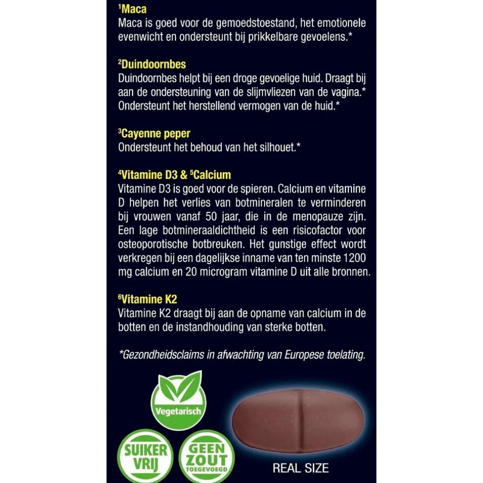 ¹Maca Maca is goed voor degemoedstoestand, het emotionele evenwichten ondersteunt bij prikkelbare gevoelens.*²Duindoornbes Duindoornbes helpt bij eendroge gevoelige huid. Draagt bij aan deondersteuning van de slijmvliezen van devagina.* Ondersteunt het herstellendvermogen van de huid.* ³Cayenne peperOndersteunt het behoud van het silhouet.* 4Vitamine D3 & 5Calcium Vitamine D3 isgoed voor de spieren. Calcium en vitamine Dhelpen het verlies van botmineralen teverminderen bij vrouwen vanaf 50 jaar, die inde menopauze zijn. Een lagebotmineraaldichtheid is een risicofactor voorosteoporotische botbreuken. Het gunstigeeffect wordt verkregen bij een dagelijkseinname van ten minste 1200 mg calcium en20 microgram vitamine D uit alle bronnen.6Vitamine K2 Vitamine K2 draagt bij aan deopname van calcium in de botten en deinstandhouding van sterke botten.*Gezondheidsclaims in afwachting vanEuropese toelating. Suikervrij. Geen zouttoegevoegd.
