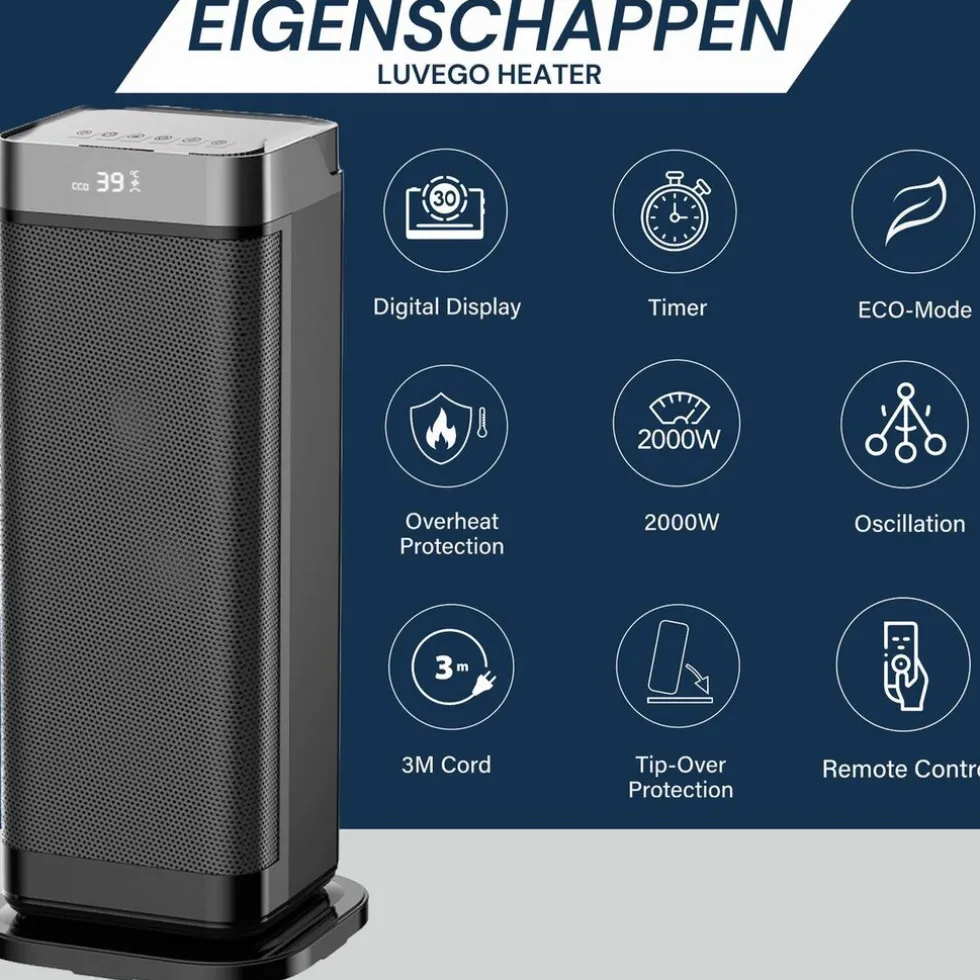 Deze elektrische heater van Luvego is de oplossing voor iedereen die tijdens de koude dagen verlangt naar een warme en knusse ruimte. Of je nu op zoek bent naar extra warmte in je woonkamer of de kilte op kantoor wilt verdrijven, de heater voorziet in wat je nodig hebt. Zijn moderne design voegt niet alleen warmte, maar ook een vleugje stijl toe aan elk interieur. Dankzij de PTC keramische verwarming, in combinatie met de ABS-behuizing, wordt de warmte snel en effectief verspreid. Het intuïtieve bedieningspaneel biedt je volledige controle over je verwarmingservaring, zodat je altijd in een comfortabele omgeving kunt vertoeven.