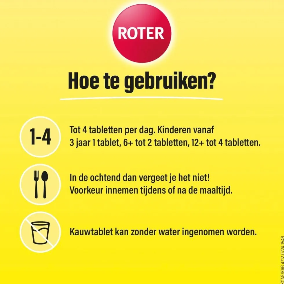 Tot 4 tabletten per dag. Kinderen vanaf 3 jaar 1 tablet, 6+ tot 2 tabletten, 12+ tot 3 tabletten. Houd je aan de aanbevolen dagelijkse dosering.