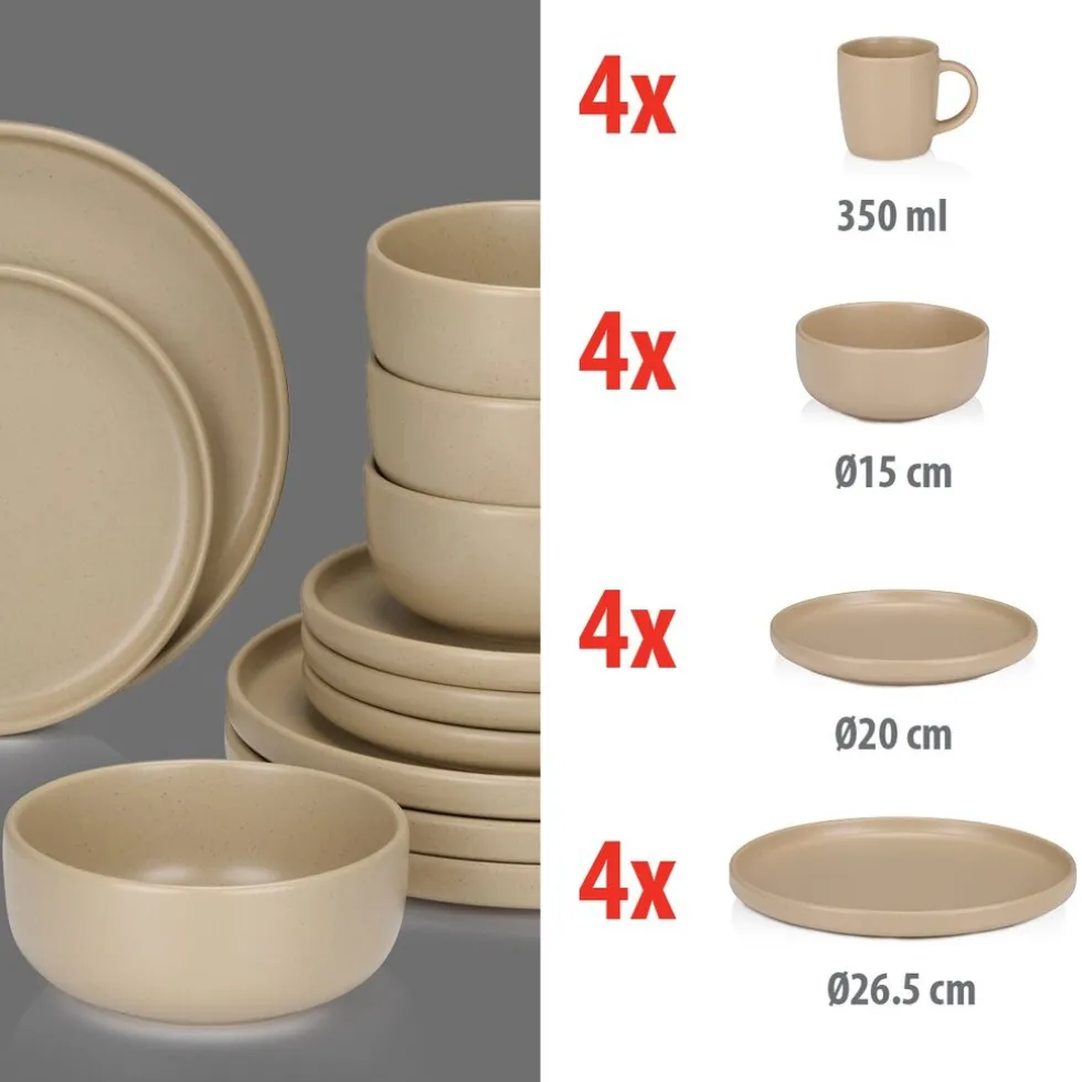 In de serviesset van alpina zitten 4 ontbijtborden, 4 dinerborden, 4 kommen en 4 mokken – perfect voor een gezelschap van in totaal 4 personen. Uiteraard kun je de set altijd uitbreiden om bij een groter gezelschap te laten passen.Specificaties alpina serviesset 16-delig zand