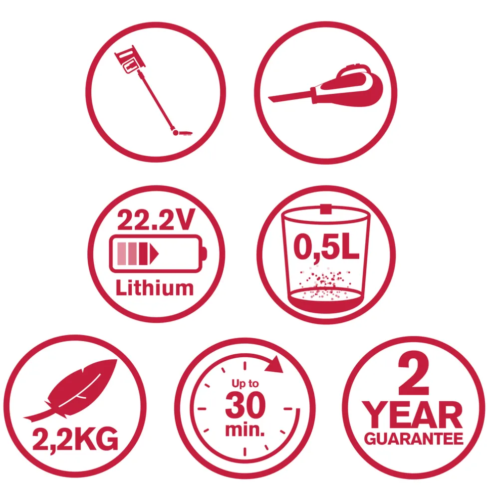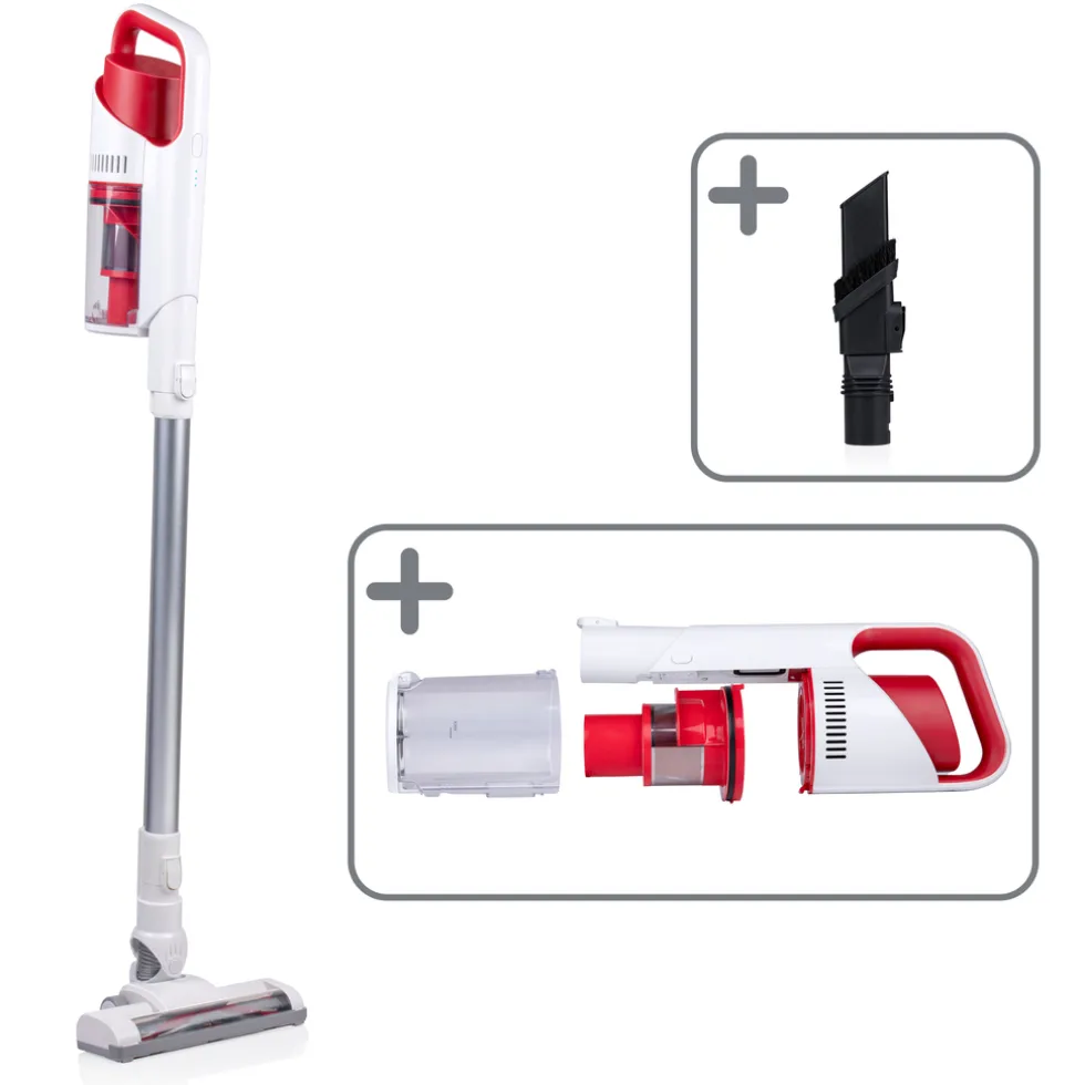De Dirt Devil draadloze stofzuiger is een echt 2-in-1 apparaat. Wanneer je de steelstofzuiger gebruikt met de steel en combizuigmond kun je gemakkelijk en snel verschillende vloertypes stof en vuil vrij maken. Verwijder je de steel en combiborstel en voeg je de meegeleerde kierenzuigmond toe dan heb je in een handomdraai een kruimelzuiger. Met deze compacte handstofzuiger kom je makkelijker op kleinere plekken zoals kieren, maar maak je tevens meubels en het interieur van je auto makkelijk schoon. De steelstofzuiger is volledig draadloos en werkt op een accu die je binnen 4,5 uur volledig oplaad. In de hoogste stand heeft de stofzuiger een bedrijfstijd van 15 minuten. In de stand met het laagste zuigvermogen gaat de draadloze stofzuiger 30 minuten mee. De stofzuiger zonder zak heeft tot slot een stof reservoir van 0,5 liter. Deze maak je na gebruik van de stofzuiger of kruimelzuiger makkelijk leeg boven een prullenbak.2-in-1: stofzuiger en handstofzuigerMet de 2-in-1 steelstofzuiger van Dirt Devil haal je niet alleen een snoerloze stofzuiger in huis, maar ook een kruimelzuiger. De stofzuiger wordt geleverd met een combiborstel, steel en kierzuigmond. Met de steel en combiborstel maak je snel en gemakkelijk verschillende vloertypes schoon. Door de steel te verwijderen en de kierzuigmond vast te klikken tover je de draadloze steelstofzuiger in een handomdraai om tot handstofzuiger. Zo kom je ook makkelijk op anders moeilijk schoon te maken plekken zoals kieren en hoekjes. Door zijn gewicht van 2,2 kilogram en de afwezigheid van een snoer, manoeuvreer je de stofzuiger gemakkelijk door het huis heen.Batterijduur tot 30 minutenDe snoerloze stofzuiger van Dirt Devil is accu aangedreven. Je laad de accu met behulp van de bijgeleverde oplaadkabel van 1 meter binnen 4,5 uur volledig op. De steelstofzuiger heeft 2 zuigstanden: laag en hoog. Op de laagste stand heeft de stofzuiger een maximale accuduur van 30 minuten. Voor de zwaardere schoonmaak kun je de steelstofzuiger op hoog zuigvermogen gebruiken. De draadloze stofzuiger gaat dan maximaal 15 minuten mee.0,5L opvangbakNaast draadloos is de Dirt Devil steelstofzuiger ook een stofzuiger zonder zak. Al het stof en vuil komt direct in de daarvoor bedoelde opvangbak terecht. Deze heeft een maximale capaciteit van 0.5 liter. Na gebruik maak je de opvangbak van de Dirt Devil stofzuiger makkelijk leeg boven een kliko of prullenbak. Door de afwezigheid van een zak kom je minder in aanraking met stof. Dit maakt de steelstofzuiger en kruimelzuiger van Dirt Devil uitermate geschikt voor mensen met allergiëen.Specificaties Dirt Devil 2-in-1 Steelstofzuiger en kruimelzuiger