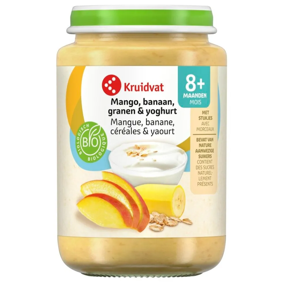 Laat je baby genieten van dit heerlijke Kruidvat 8+M Bio Mango, Banaan, Granen & Yoghurt Fruithapje. Het fruithapje is geschikt voor kindjes vanaf 8 maanden.