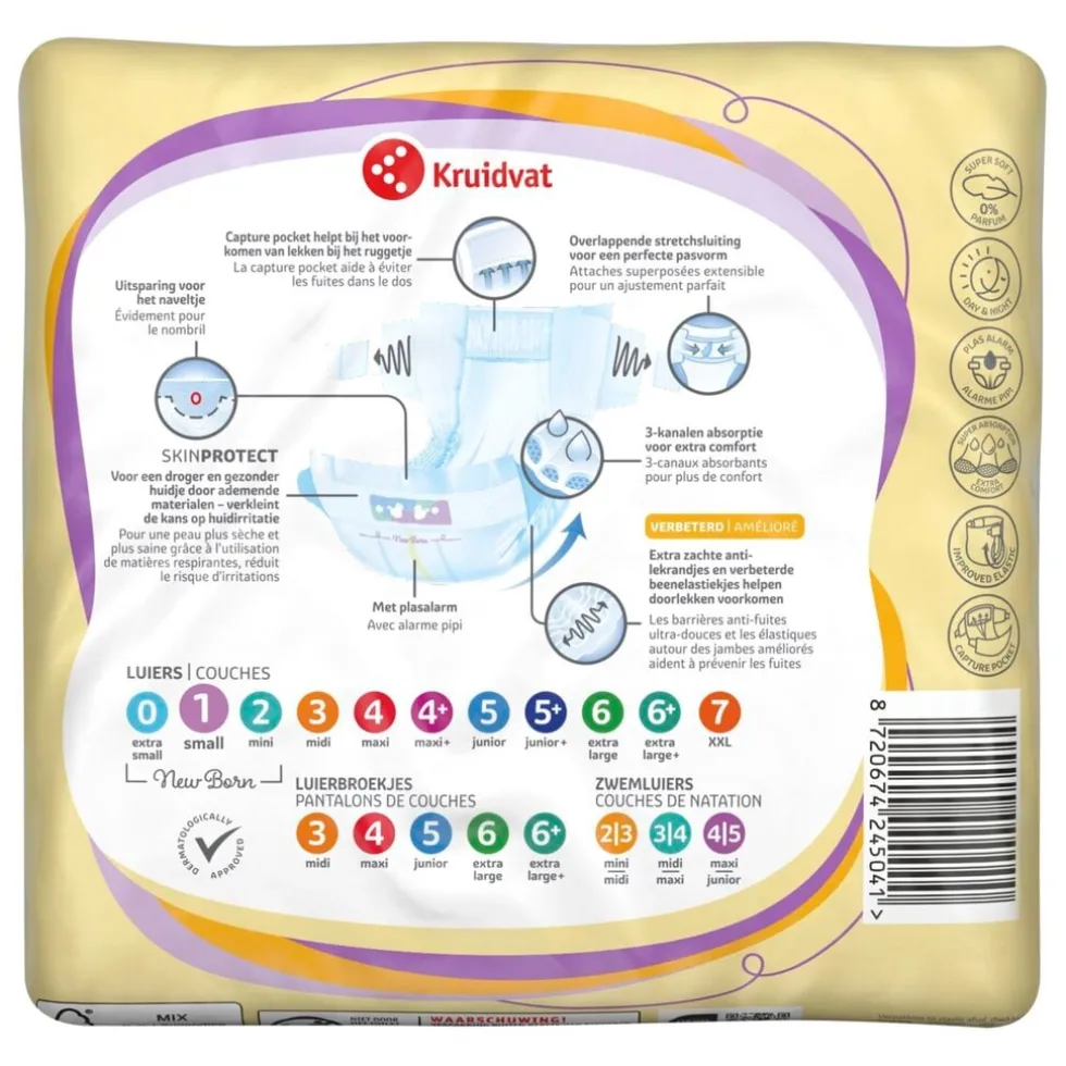 Wist je dat, één op de twee baby’s in Nederland een luier draagt van Kruidvat?* Als je kiest voor Kruidvat NewBorn Small Maat 1 Luiers Smallpack, kies je voor uitstekende kwaliteit en zachtheid, voor een Kruidvat-prijs.