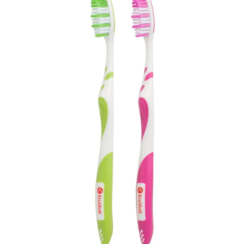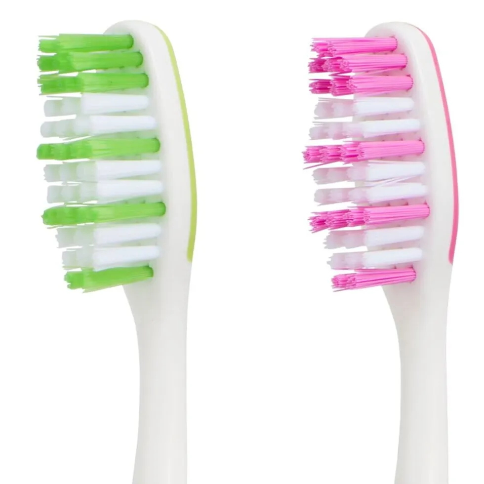 De lange haren masseren zacht je tandvlees, terwijl de kortere haren tandplak verwijderen. De afgeronde borstelharen voorkomen beschadiging van het tandvlees. De tandenborstels hebben een antislip duimgrip voor controle en comfort.