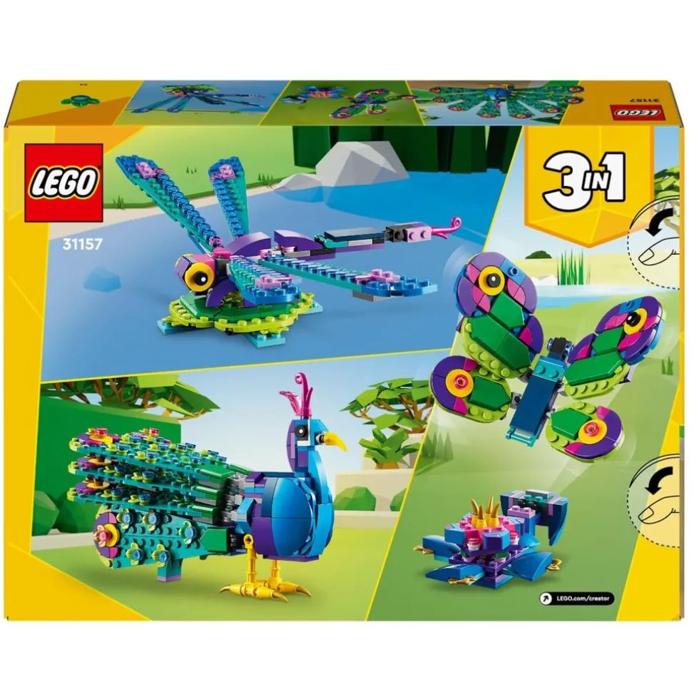 Speel je eigen verhalen na met drie verschillende dierenmodellen: een pauw, een libelle en een vlinder met deze indrukwekkende LEGO Creator 31157 3-in-1 Exotische Pauw bouwset.