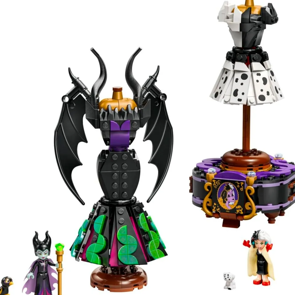De LEGO Disney 43262 De jurken van Maleficent en Cruella de Vil bevat bouwbare jurken van klassieke Disney schurken, twee kledinghouders en een displaystandaard met een verborgen ruimte voor de Disney poppetjes.