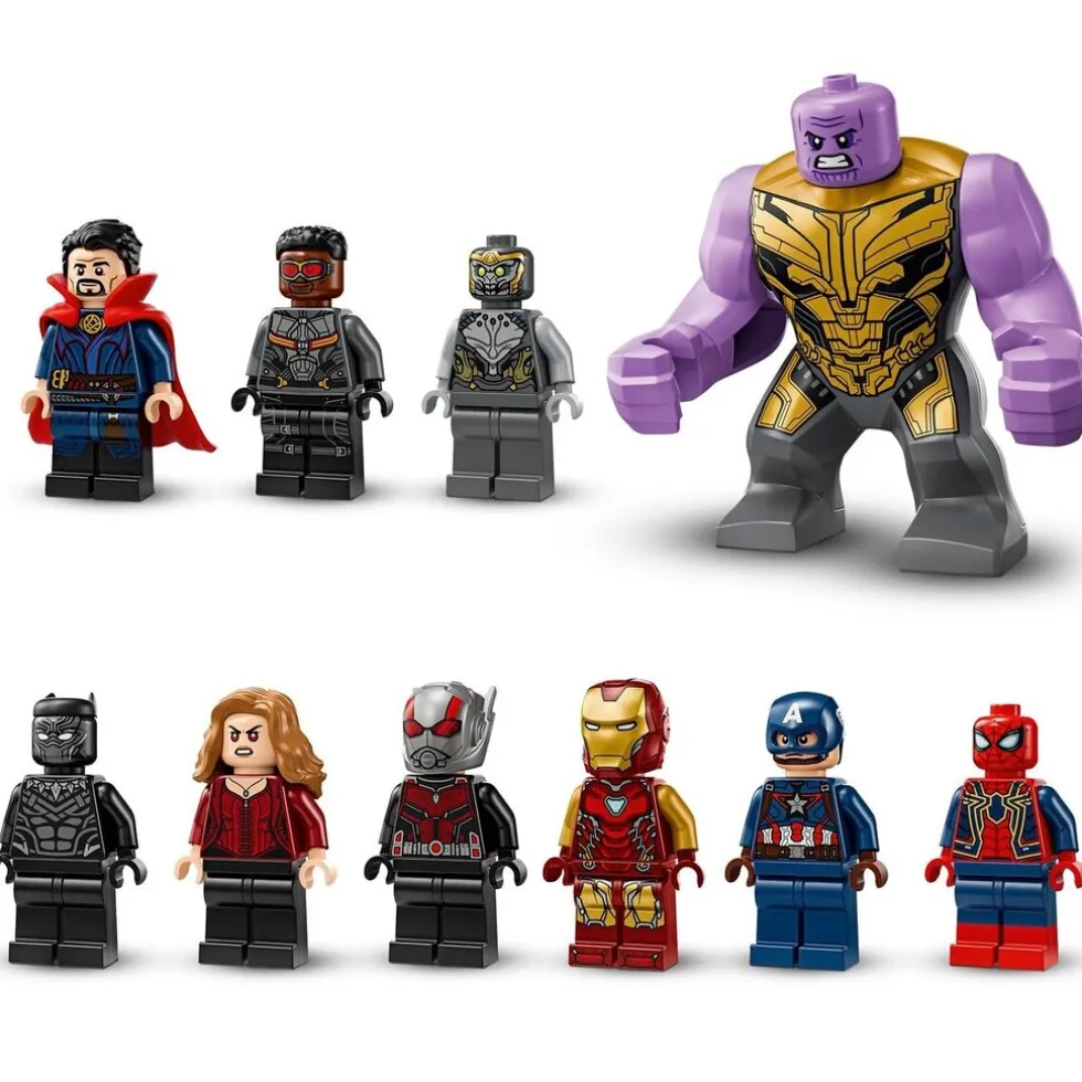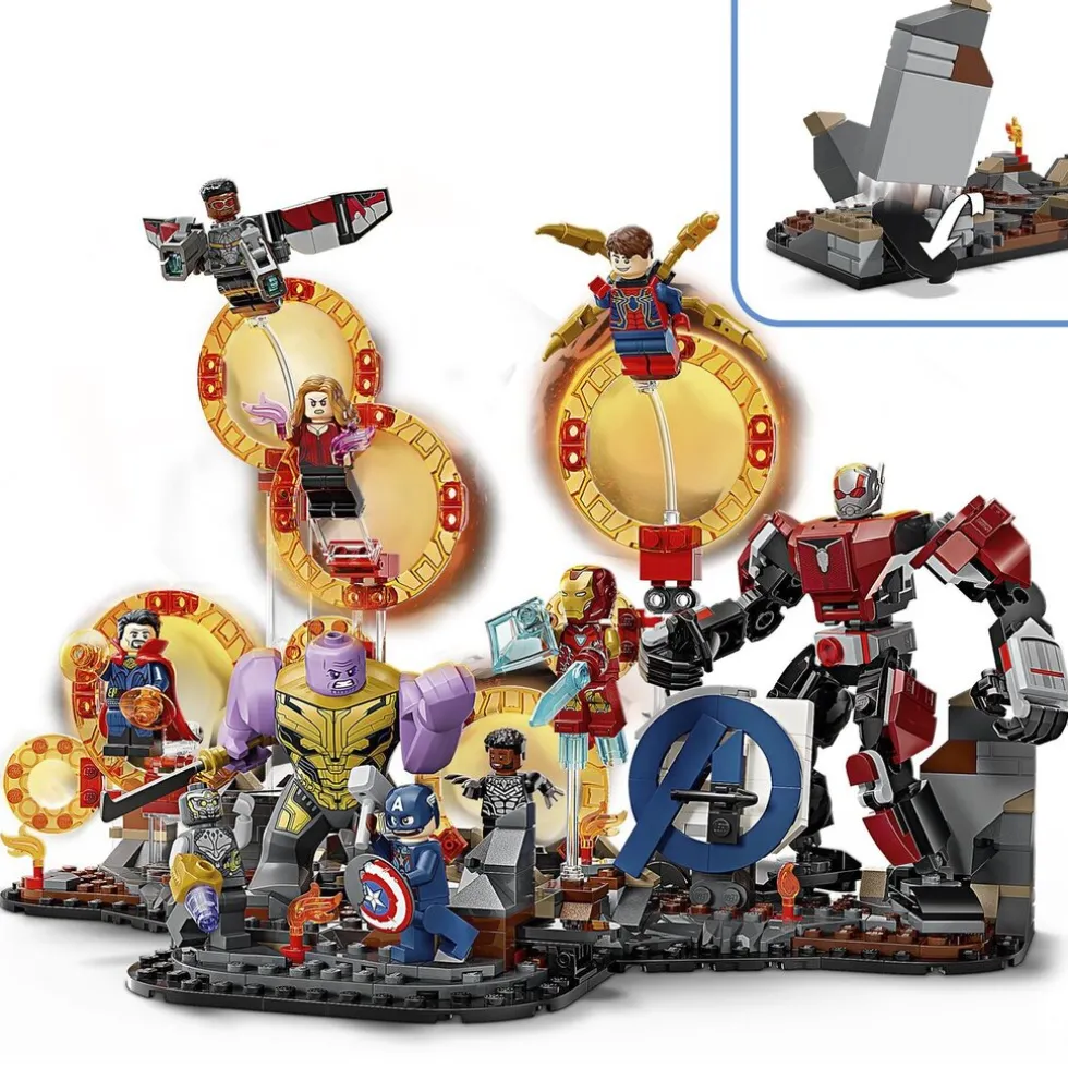 Speel de grootste confrontatie uit de Marvel Studios film Avengers: Endgame na met deze bouwbare speelset met interdimensionale portalen en negen minifiguren: Captain America (met schild), Iron Man MK85 (met zwaard en schild), een Chitauri (met op de arm gemonteerde schieter), Ant-Man, Scarlet Witch (met vlamelementen), Doctor Strange, Iron Spider (met vier beweegbare ‘benen’ op zijn rug), Black Panther en Falcon (met twee noppenschieters). Een groot figuur van Thanos, een volledig verstelbare Ant-Man mecha, twee rotsexplosiefuncties en een veelzijdige indeling zorgen voor volop actie.