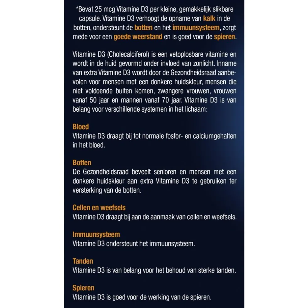 Vitamine D3 verhoogt de opname van kalk inde botten, ondersteunt de botten en hetimmuunsysteem, draagt bij aan een sterkgebit, zorgt mede voor een goede weerstanden is goed voor de spieren. Bloed: VitamineD3 draagt bij tot normale fosfor- encalciumgehalten in het bloed. Cellen enweefsels: Vitamine D3 draagt bij aan deaanmaak van cellen en weefsels. Bevat geenzout. Geen suikers toegevoegd.