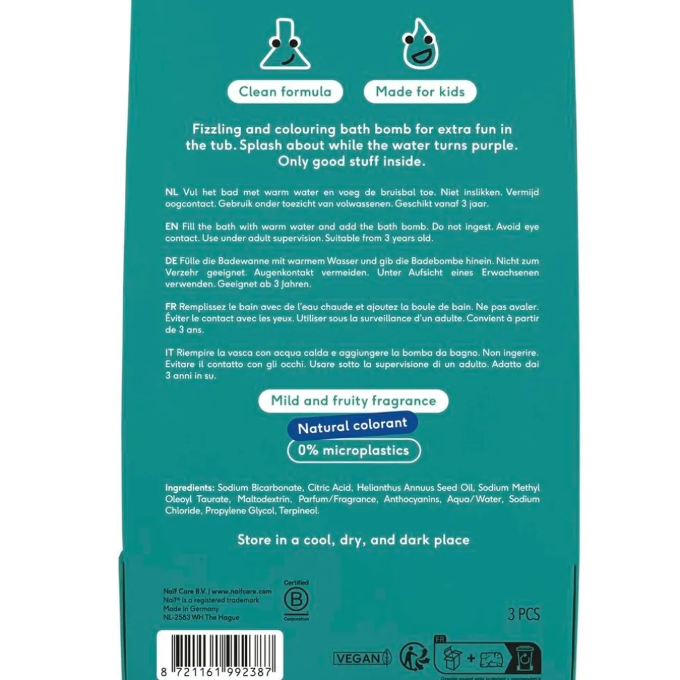 Meer badbommen is meer fun! De verpakking van Naïf Kids Bath Bombs bevat drie kleine, paarse bruisballen die zacht bruisen en het water een speelse kleur geven.