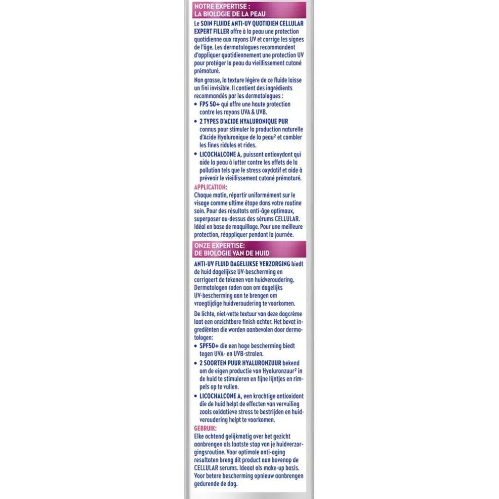 Direct na het aanbrengen hydrateert, verzacht en beschermt de NIVEA Cellular Expert Filler Anti-Uv Daily Fluid je huid tegen hoge uv A- en B-straling. Na een week gebruik is je huid 31% gladder en stralender. Na twee weken worden fijne lijntjes en rimpels verminderd, waardoor je huid er zichtbaar jonger uitziet.