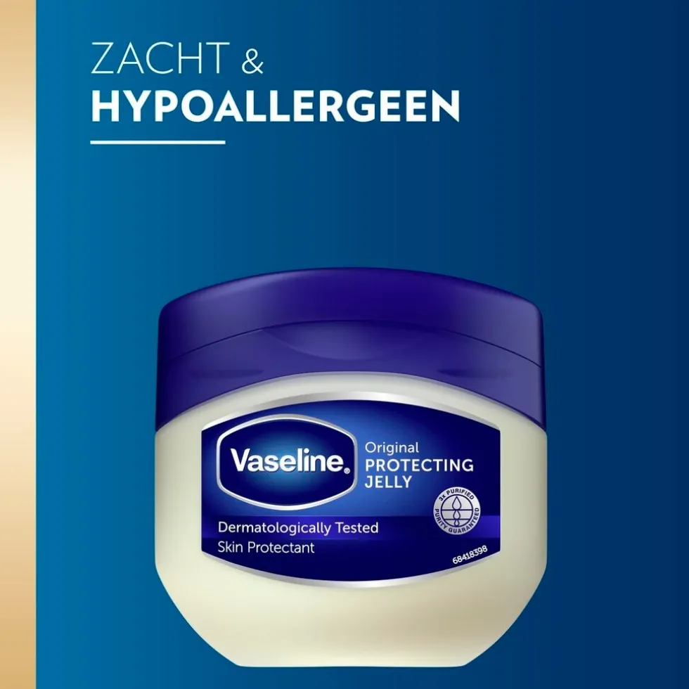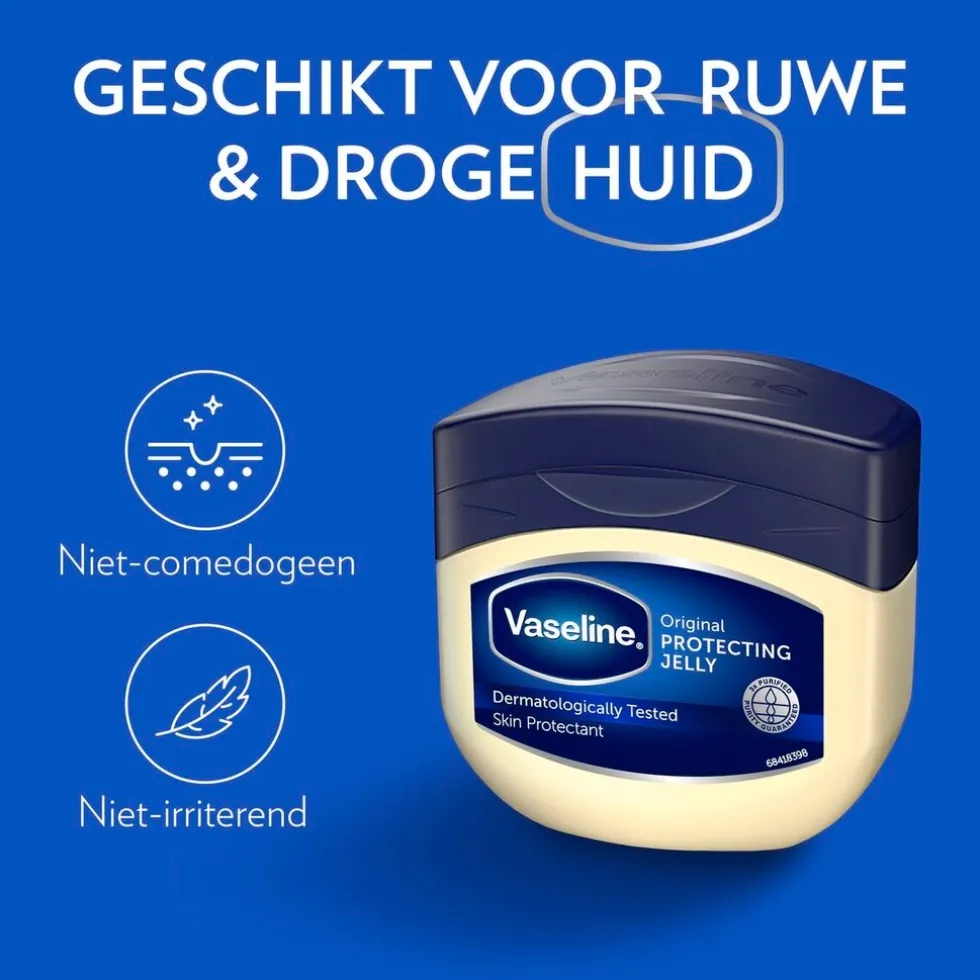 Vaseline Original Petroleum Jelly is dermatologisch getest, irriteert niet en is daarom zeer geschikt voor gebruik op geïrriteerde ruwe en droge huid. Deze jelly helpt het vocht in je huid aan te vullen, zodat deze zichzelf herstelt. Vaseline legt namelijk een beschermend laagje op je huid dat vochtverlies helpt voorkomen. De jelly werkt als een vochtinbrengende crème voor de droge huid, als lippenbalsem of zelfs als babycrème.