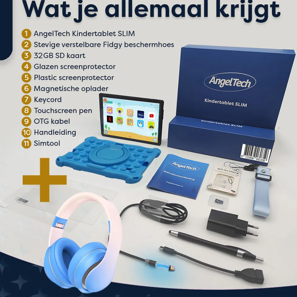 Ontdek het AngelTech Kinderpakket SLIM! Dit complete pakket omvat de indrukwekkende AngelTech Kindertablet SLIM – eenkindertablet van topkwaliteit en snelle prestatiesen de AngelTechOver-Ear Kinderkoptelefoon, met ingebouwdekindvriendlijke volumebegrenzingen methoog kwaliteit surround-sound. Met dit combipakket ontvang je alles wat je nodig hebt!