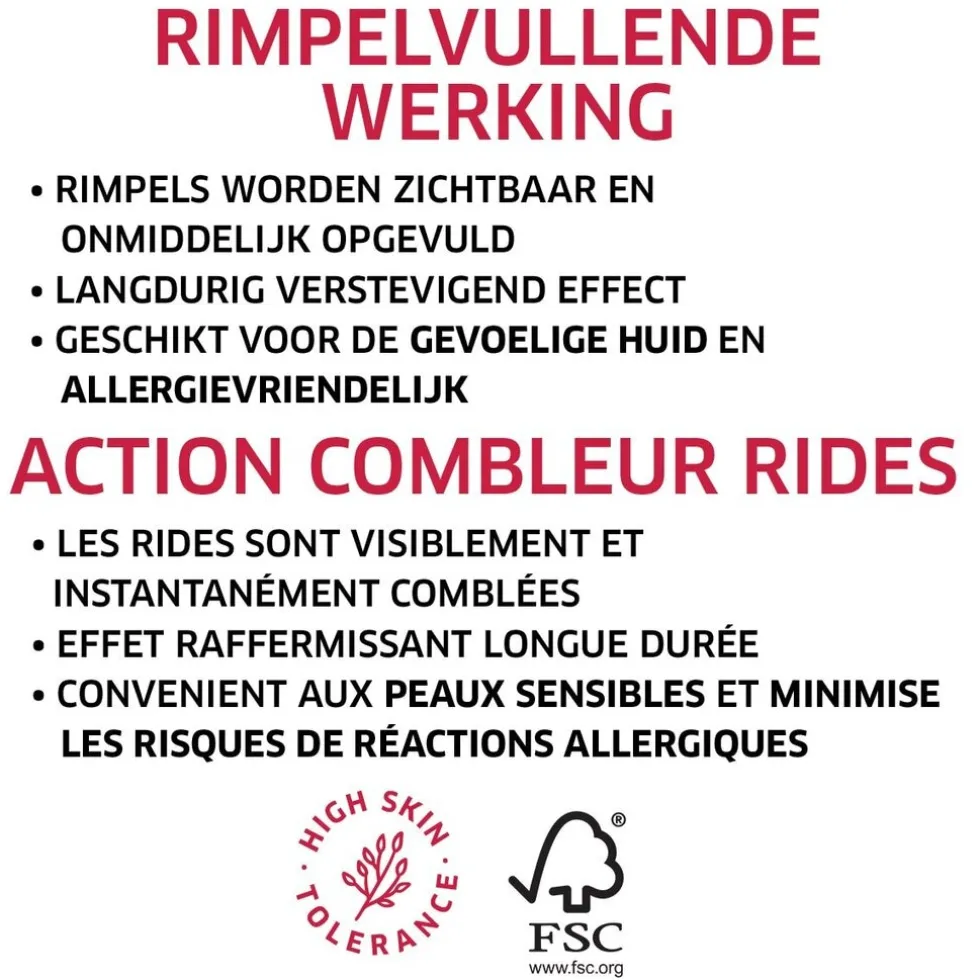 De formule werkt in op rimpels door lijntjes op te vullen en het huidoppervlak te verzachten. Rimpels worden zichtbaar opgevuld na 30 minuten.