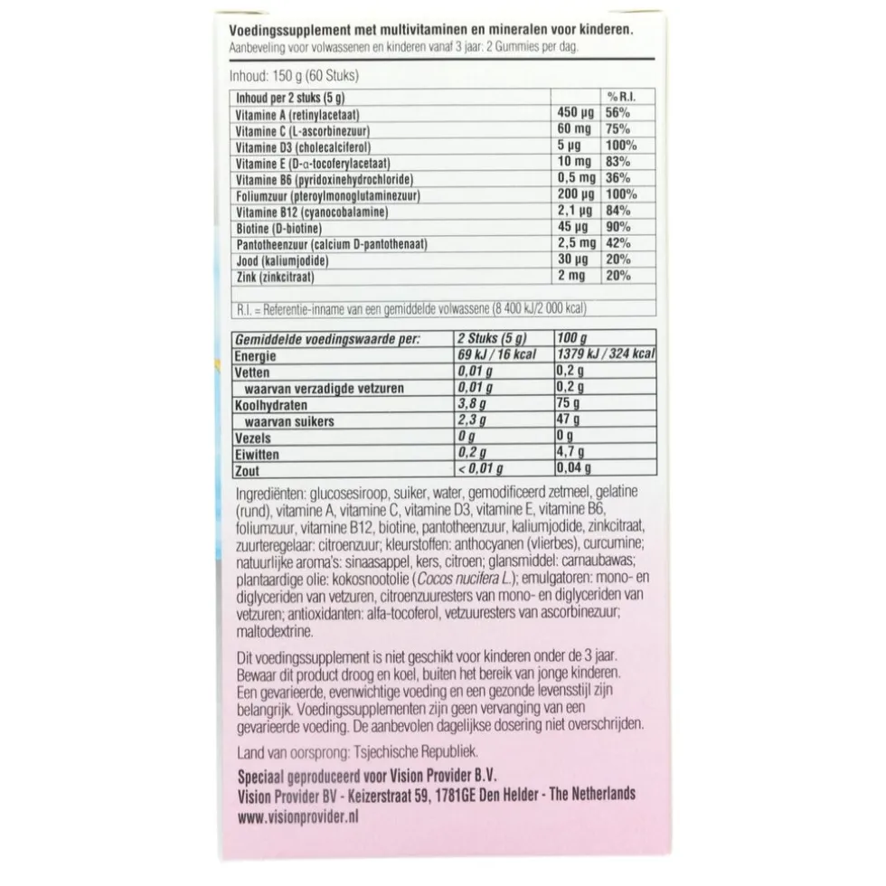 Samenstelling per dagdosering (2 gummies): vitamine A 450µg 56%RI/AR, vitamine C 60mg 75%RI/AR, vitamine D3 5µg 100% RI/AR, vitamine E 10mg 83%RI/AR, vitamine B6 0,5mg 36%RI/AR, foliumzuur 200µg 100%RI/AR, vitamine B12 2,1µg 84%RI/AR, biotine 45µg 90%RI/AR, pantotheenzuur 2,5mg 42%RI/AR, kaliumjodide 30µg 20%RI/AR, zinkcitraat 2mg 20%RI/AR. R.I. = Referentie-Inname / A.R. = Apport de référence.