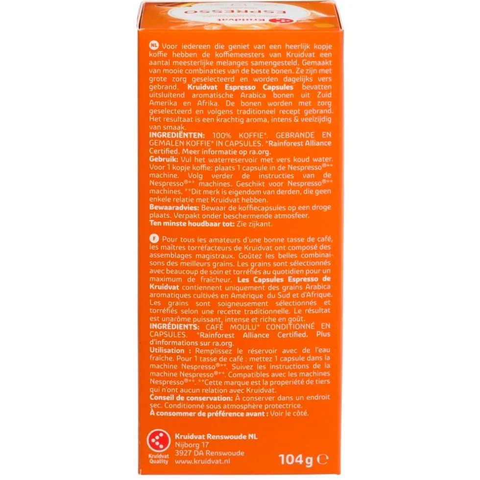 De Kruidvat Espresso Koffiecapsules zijn geschikt voor Nespresso*-machines. Bewaar de koffie op een droge plaats. De capsules zijn verpakt onder beschermende atmosfeer en Rainforest Allaince Certified.