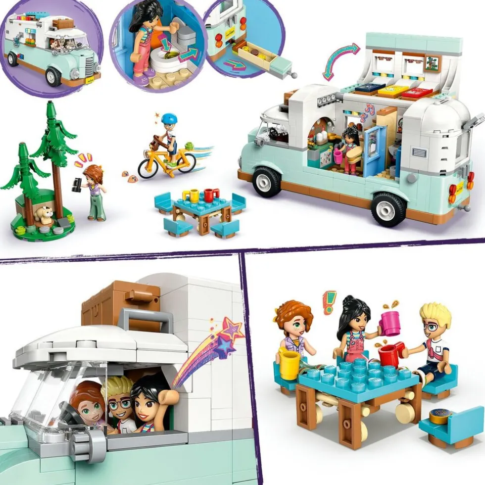 Ontdek veel speelmogelijkheden als je de wagen opent en toegang krijgt tot het gedetailleerde interieur, waar ruimte is om te koken, slapen en ontspannen. De set komt met drie 3 LEGO Friends poppetjes en een figuur van een fret om urenlang fantasierijke avonturen na te spelen. De camperset is inclusief een fiets, een picknicktafel, een toilet dat kan worden doorgespoeld, een buitendouche en tal van speelgoedaccessoires, waaronder een verrekijker, een kompas en een moersleutel.