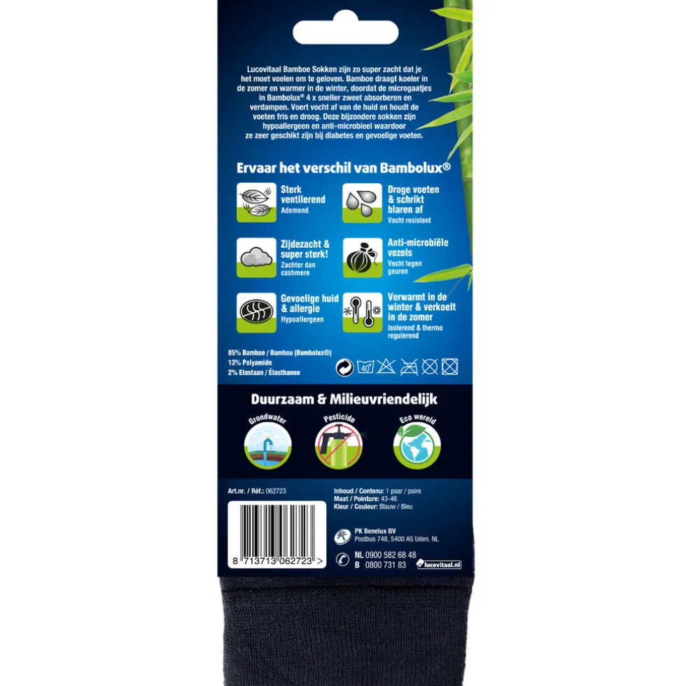 Lucovitaal Bamboe Sokken zijn zo super zacht dat je het moet voelen om te geloven. Bamboe draagt koeler in de zomer en warmer in de winter, doordat de microgaatjes in Bambolux® 4x sneller zweet absorberen en verdampen. Voert vocht af van de huid en houdt de voeten fris en droog. Deze bijzondere sokken zijn hypoallergeen en anti-microbieel waardoor ze zeer geschikt zijn bij gevoelige voeten.
